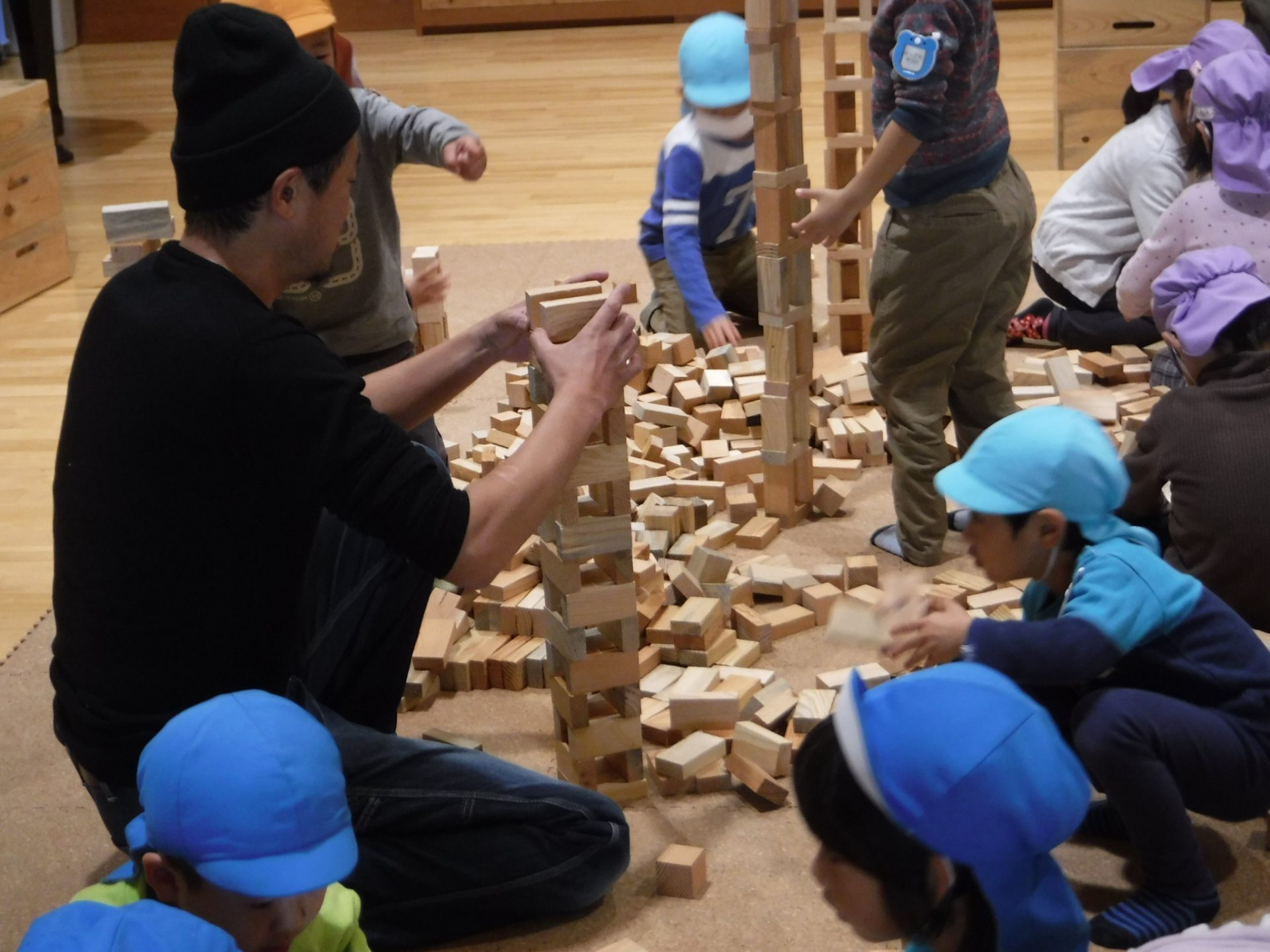 「次はね、つみ木で線を作ってあるので、その上に全員で積んでみよう!」