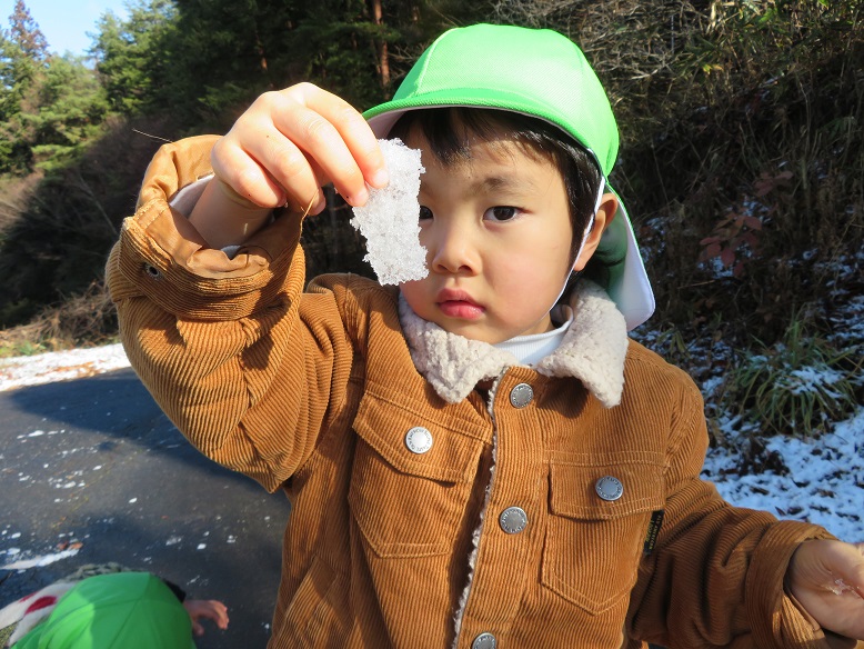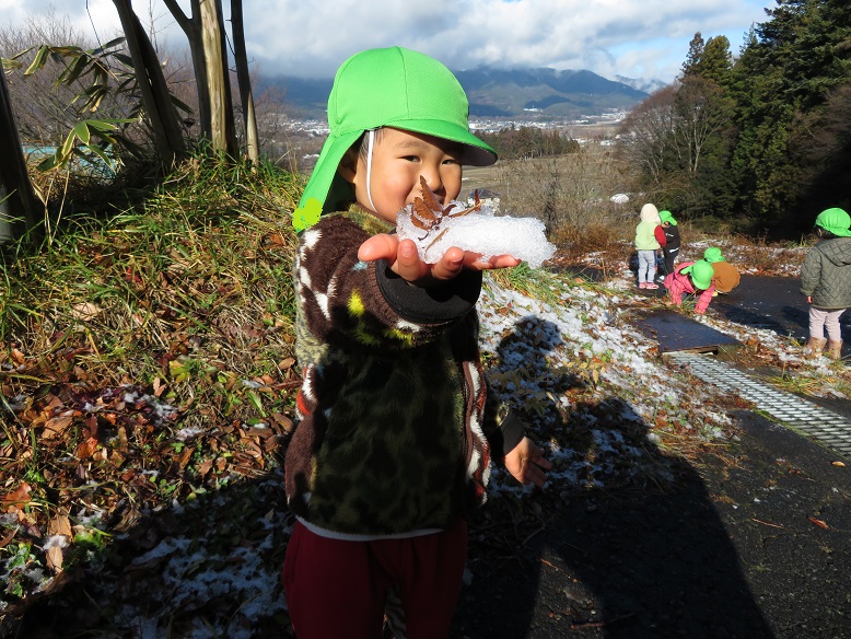 「この雪には、葉っぱが挟まってるよ!面白いね。」