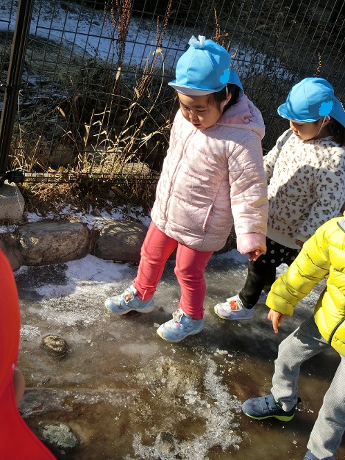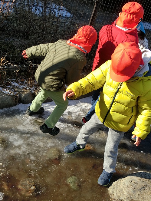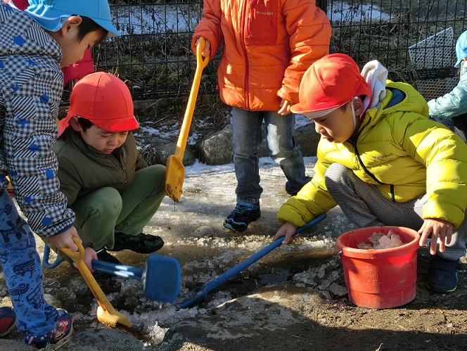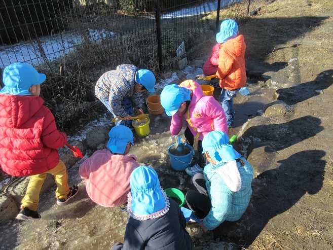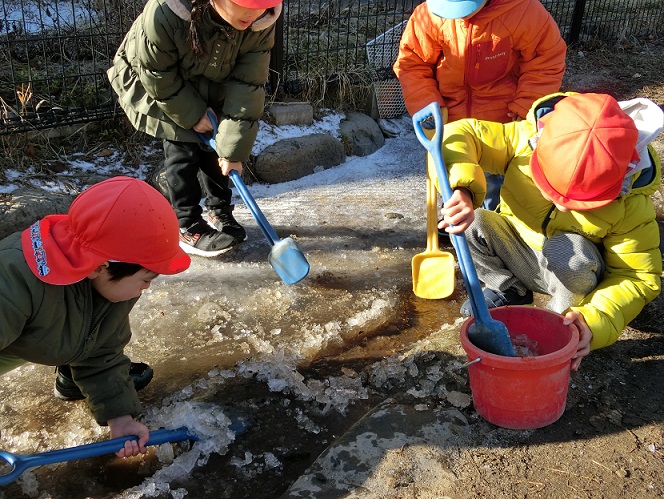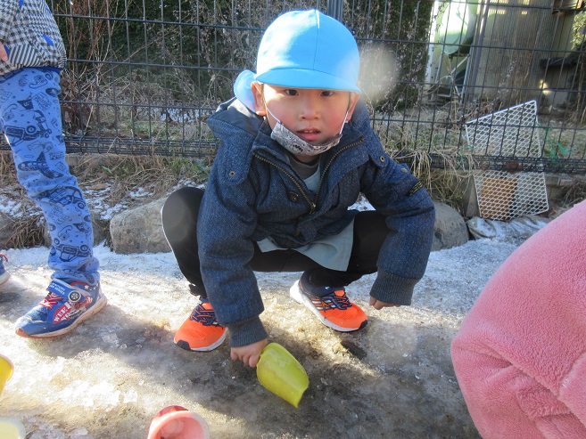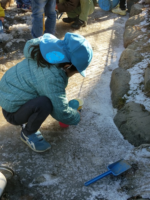 氷が出来ていることに子ども達はすぐに気づきました。自然の変化を観察できる環境が園庭にあるのは良いと感じました。