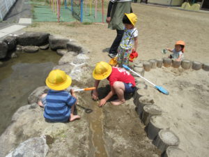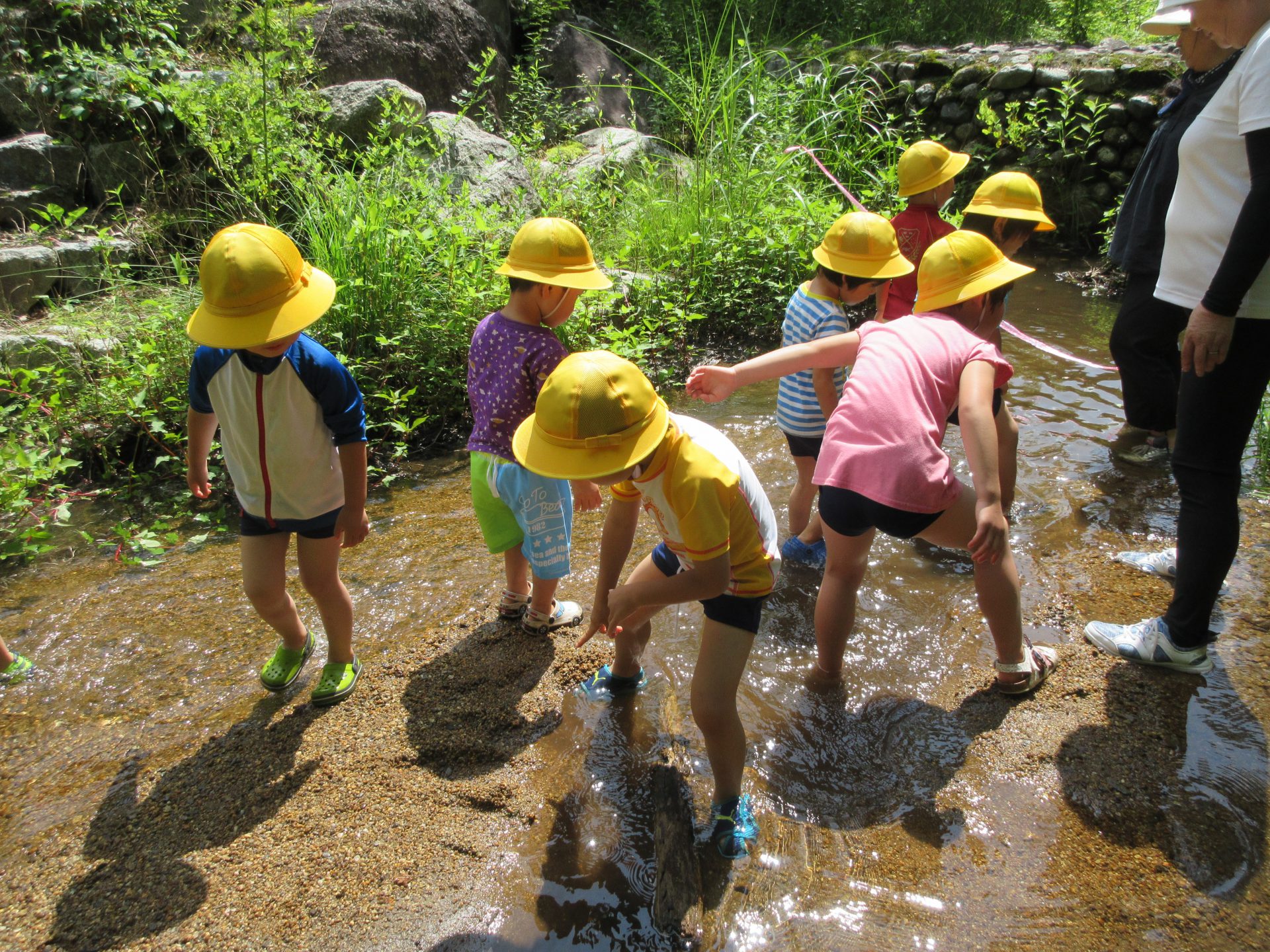 草花の色水遊び。園庭にある池で水遊び、魚のつかみ取り。ネバーランドでの川遊び、魚、タニシ、やご、おたまじゃくしを捕まえる。畑の野菜の収穫、カレーを作り収穫祭。さつま芋苗植え。