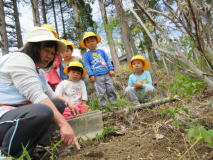 ヒメオドリコソウ、たんぽぽ、よもぎなどの採集。桜や花桃を見に行く。シロツメ草で首輪、腕輪作り。畑に野菜の苗植え、草取り、水やり。ちょうちょう、カエル、てんとう虫、沢がになどを捕まえる。ヤギとの触れあい。ネバーランド(村内施設)でのカブトムシの幼虫探し、牛との触れあい。