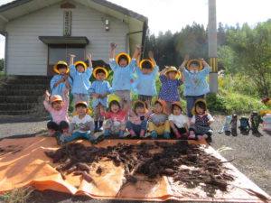 保育所周辺に、山や田んぼ、畑があり、豊かな自然に囲まれていて、季節折々の草花・山菜の採集、生き物の捕獲などを楽しむことができます。村の子として地域の方に声をかけていただいたき、田んぼのあぜなどで遊ばせていただくこともあります。歩いていける距離に園の畑があり、ジャガイモやさつま芋を地域の方と交流しながら育て、収穫を楽しんでいます。