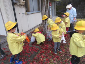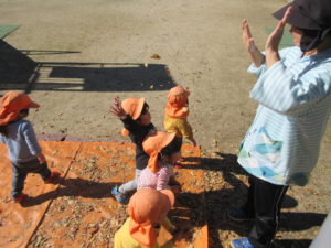 ススキ、どんぐり、松ぼっくりなど採集。写真や絵を見ながら木の実や秋を探す。さつま芋の収穫、焼き芋大会。トンボ、ばったを捕まえる。落ち葉の踏んだ音を楽しむ、きれいな色の葉っぱを拾う、葉っぱを舞い上げて楽しむ。さつま芋のつるを丸めクリスマスリース作り。