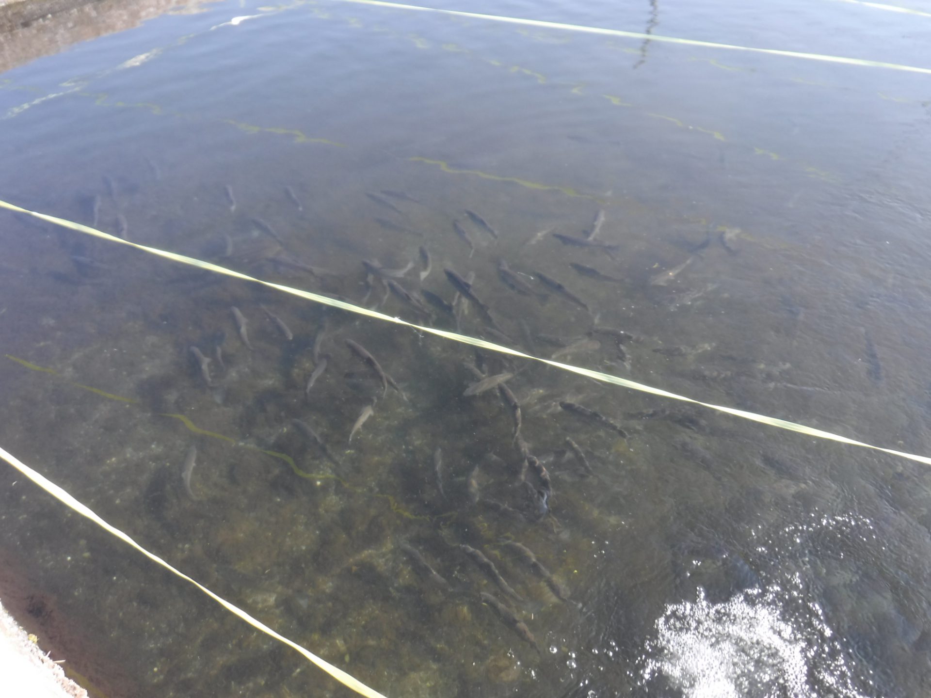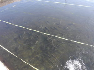 水産試験場では、いけすに信州サーモンやニジマスなどの魚がたくさん泳いでいました。