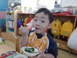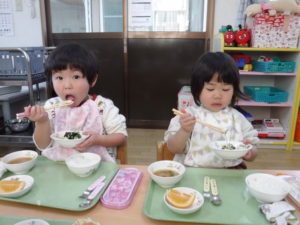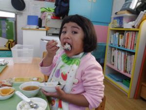 ・給食で信州サーモンを食べる時に、散歩で見た魚と一緒だということを伝え、命をいただいていることや「いただきます」のあいさつにも意味があることを伝える機会にしたい。