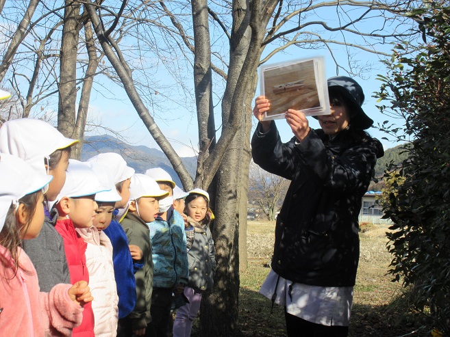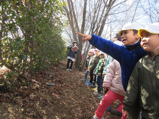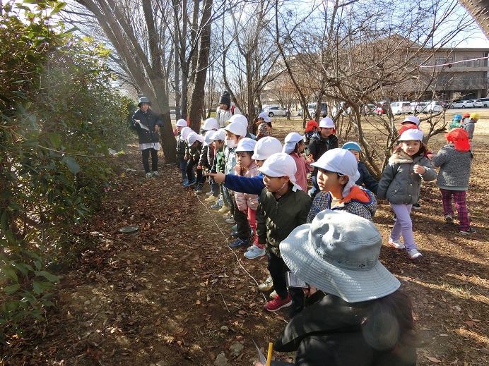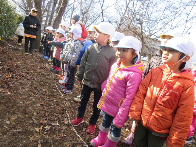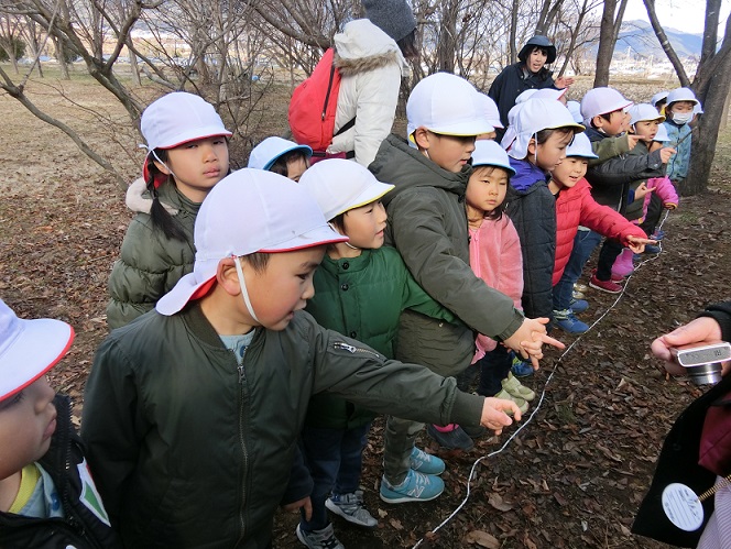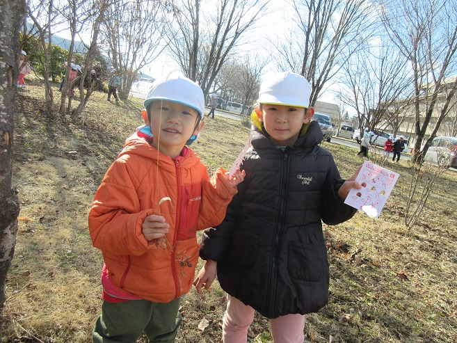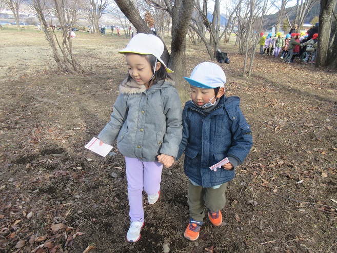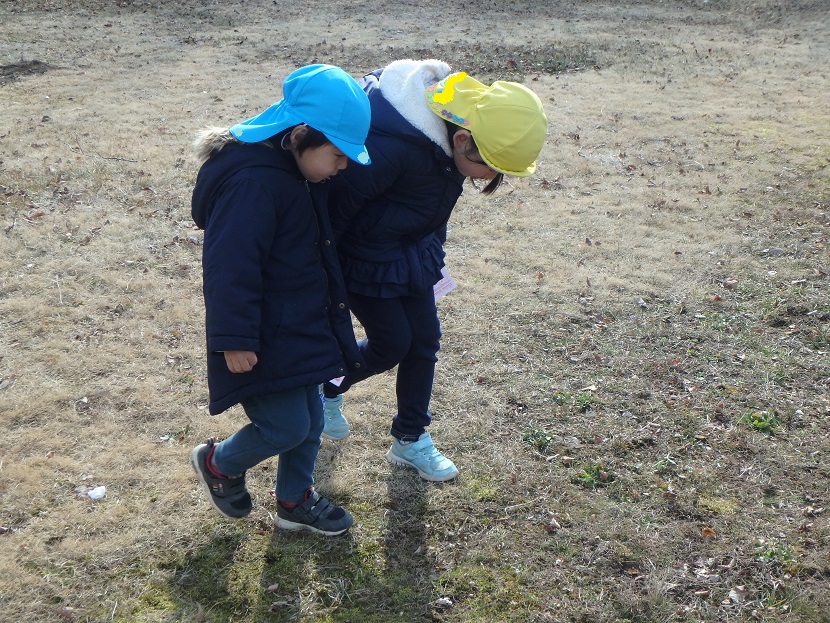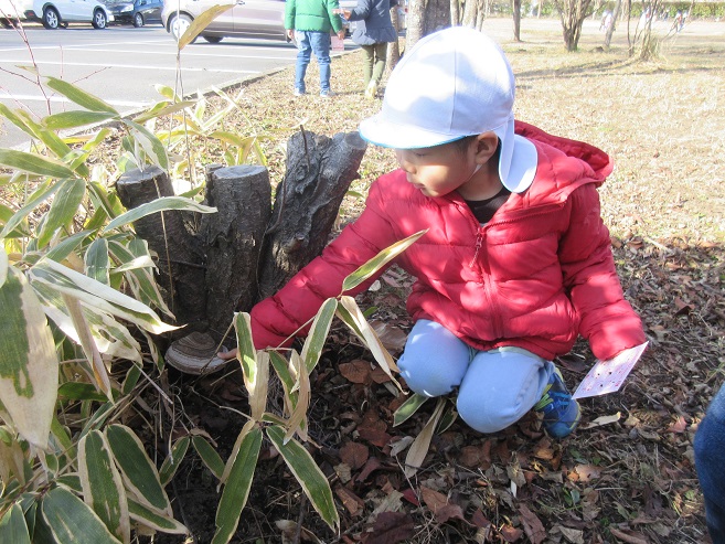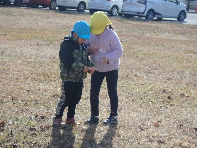 フィールドビンゴでは、冬になり昆虫や花などが見つけにくくなっていました。子ども達も「冬ごもりしているのかな~?」と言いながら探す姿もあり、見つけにくい事も季節の変化を感じる事に繋がっているように感じました。