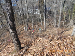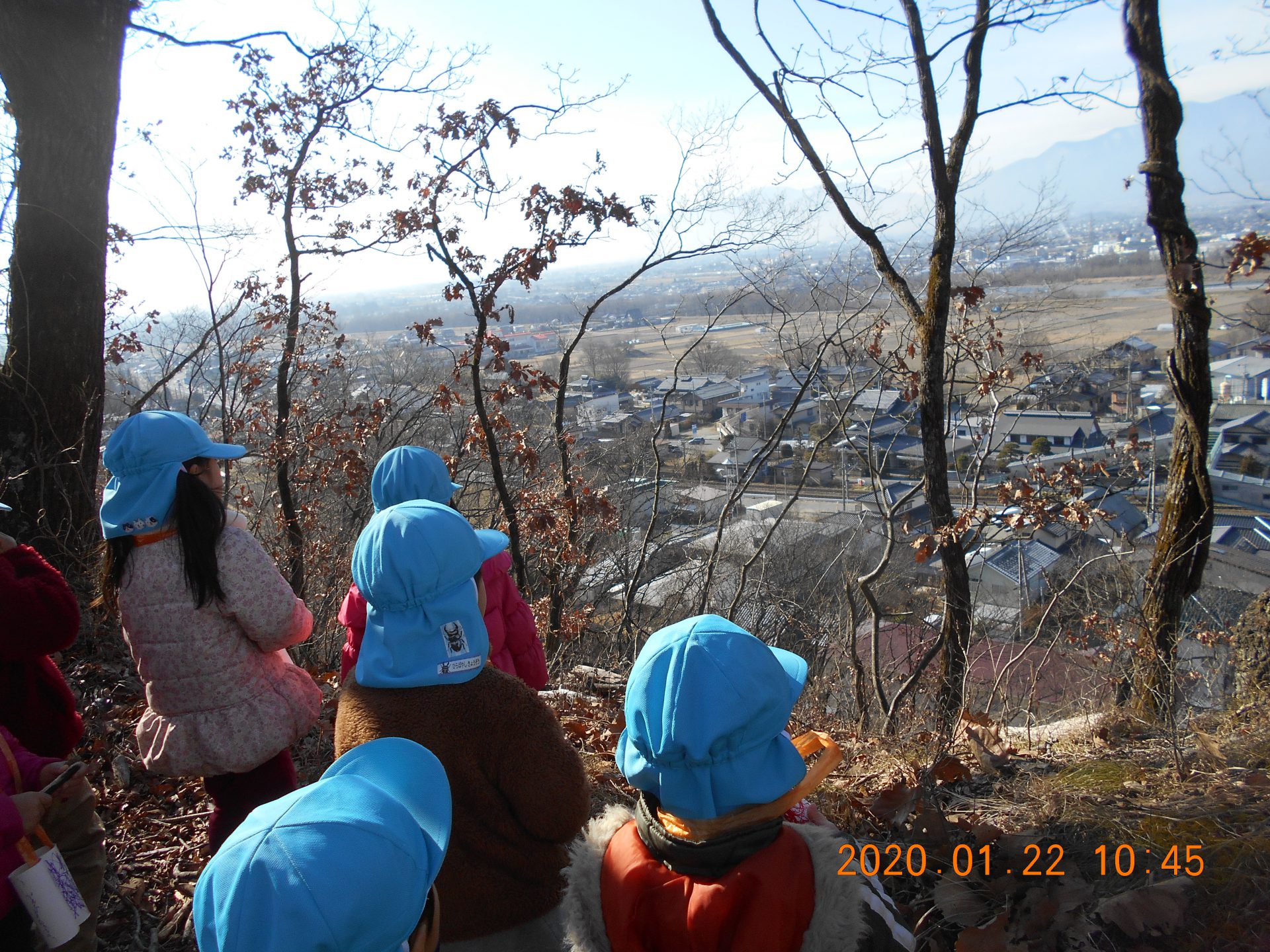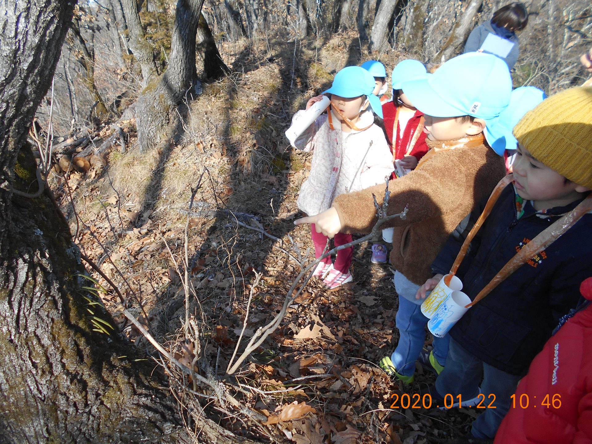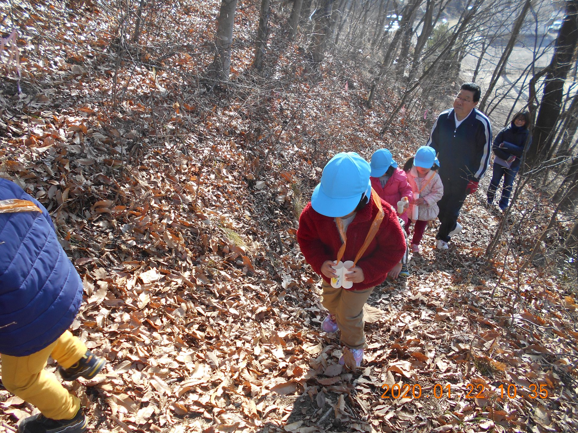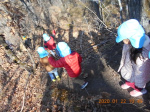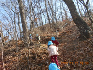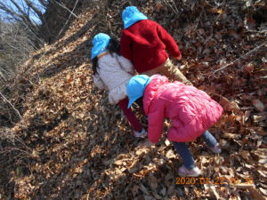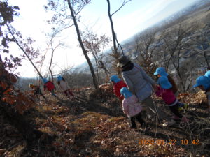さあ、山を下ってこども園に帰ります。落葉の中を「ザックザック」と音を立てて進みます。どんどん下って行きます。