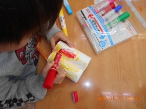 園の裏山に登り遊ぶのが大好きな3歳児。季節に応じて草や木の実、虫を見つけては、名前を調べ飼育してきました。山の高い場所まで登れるようになり、景色を見ては大騒ぎです。そんなある日、子ども達が「望遠鏡で見たい。」と言い望遠鏡作りが始まりました。きょうは、自分の望遠鏡に色を塗ります。大好きなカブト虫の絵を描いて満足顔の男の子です。