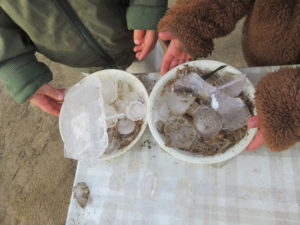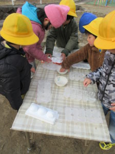 そのような中、天気予報を見たところ、寒い日があったので、前日に子ども達と様々な型や空容器を使って、水を入れて凍らせてみた。