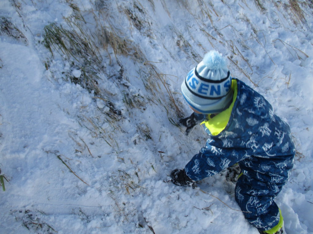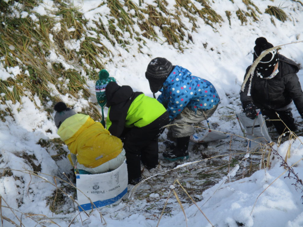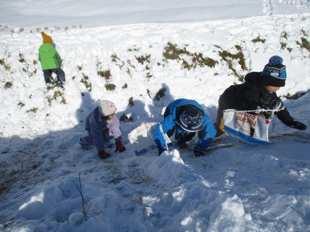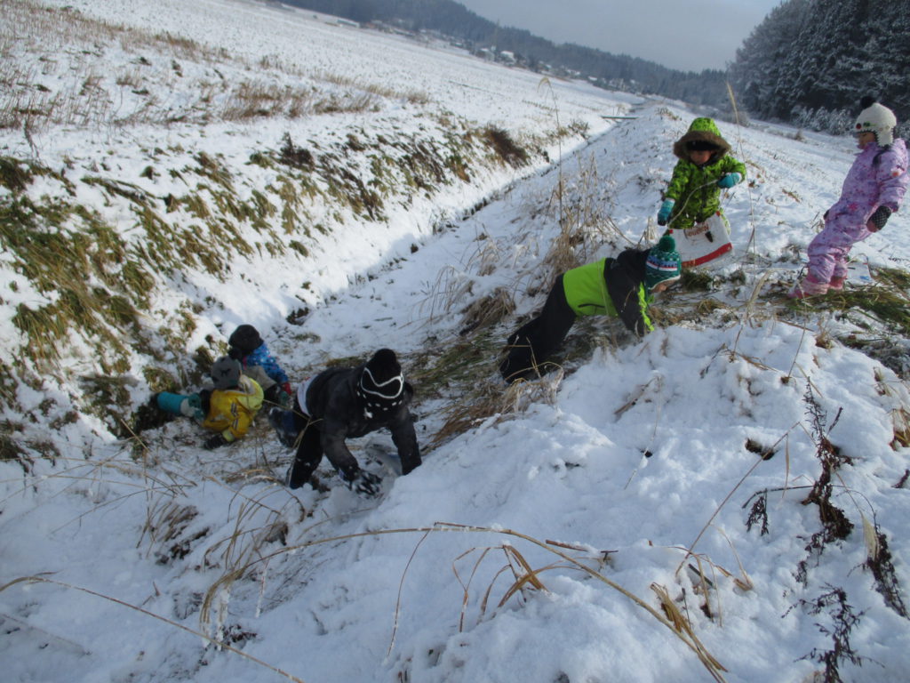 雪が降った日には農道の土手も楽しい場所です。さっそくそり遊びを楽しみます。