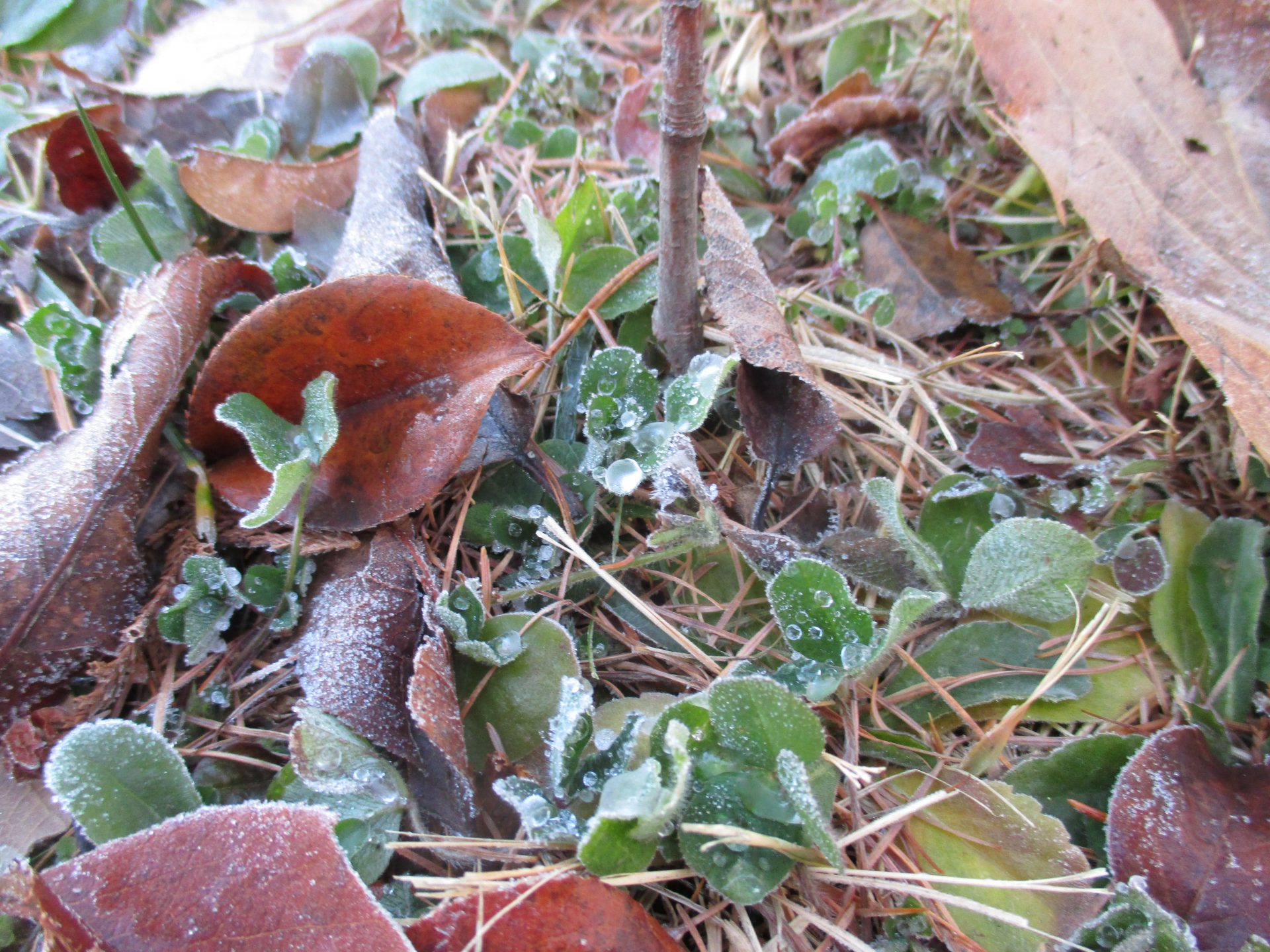 「葉っぱが白くなってキラキラしてる。」 凍った葉っぱをみつけたよ。