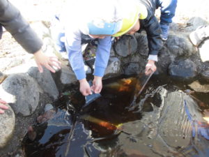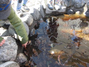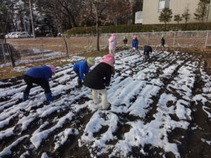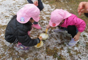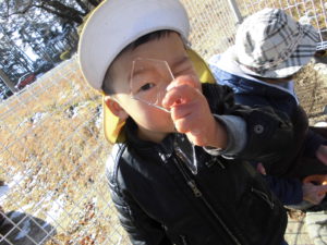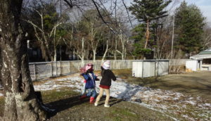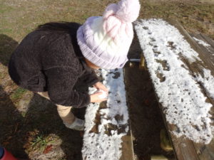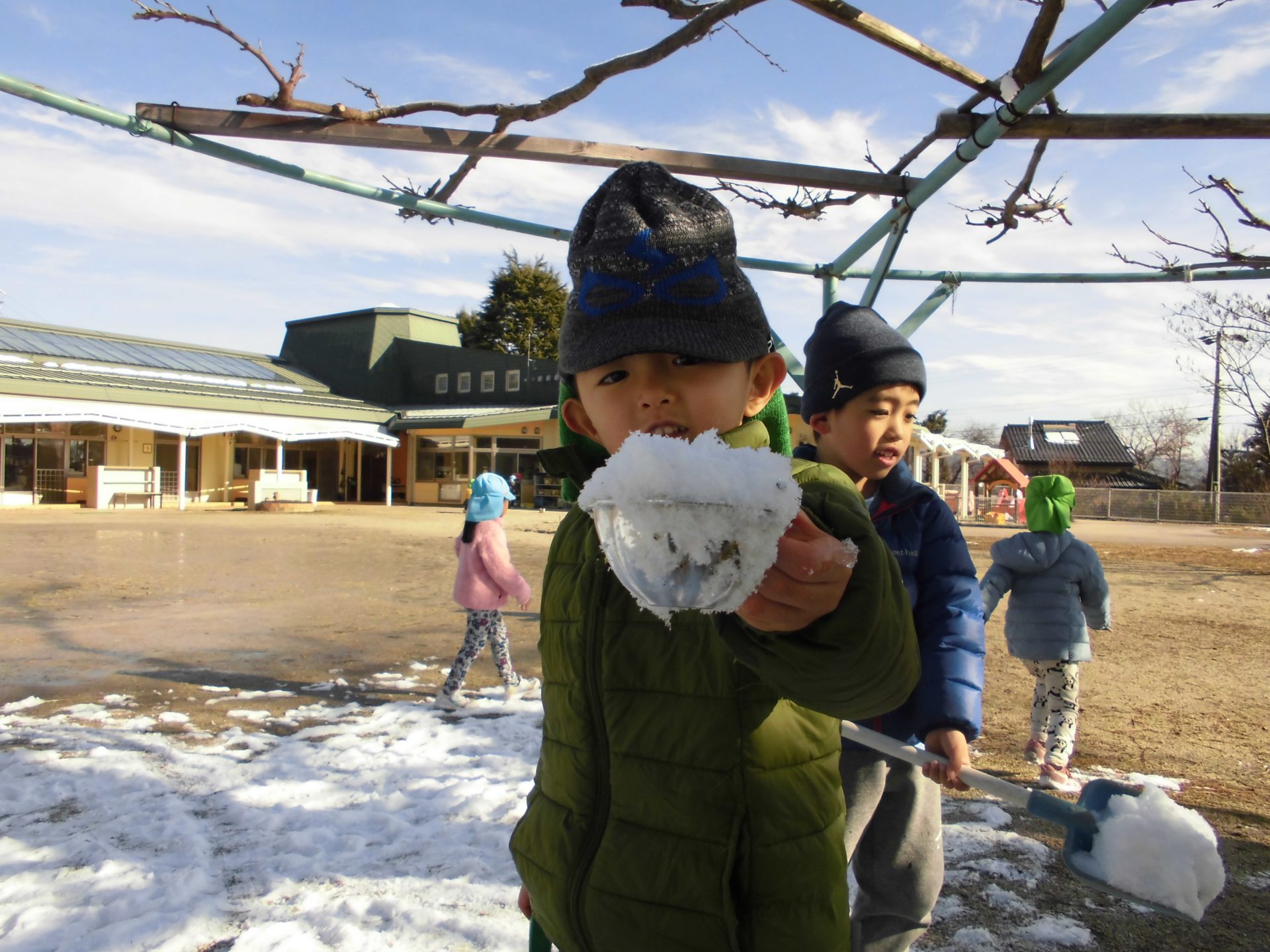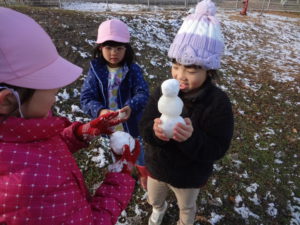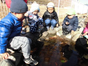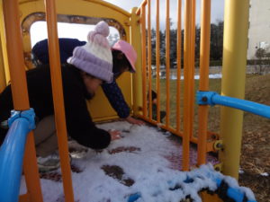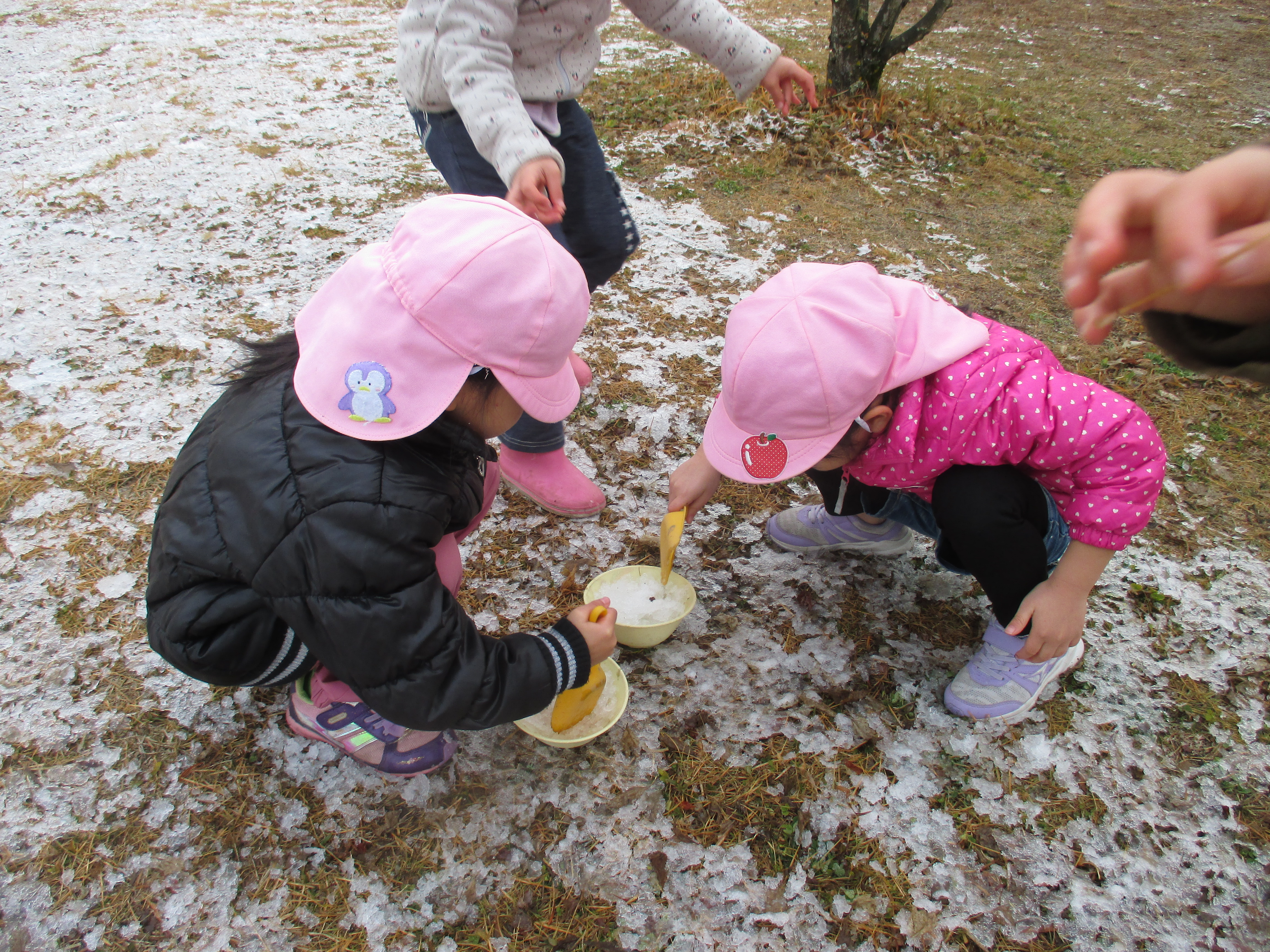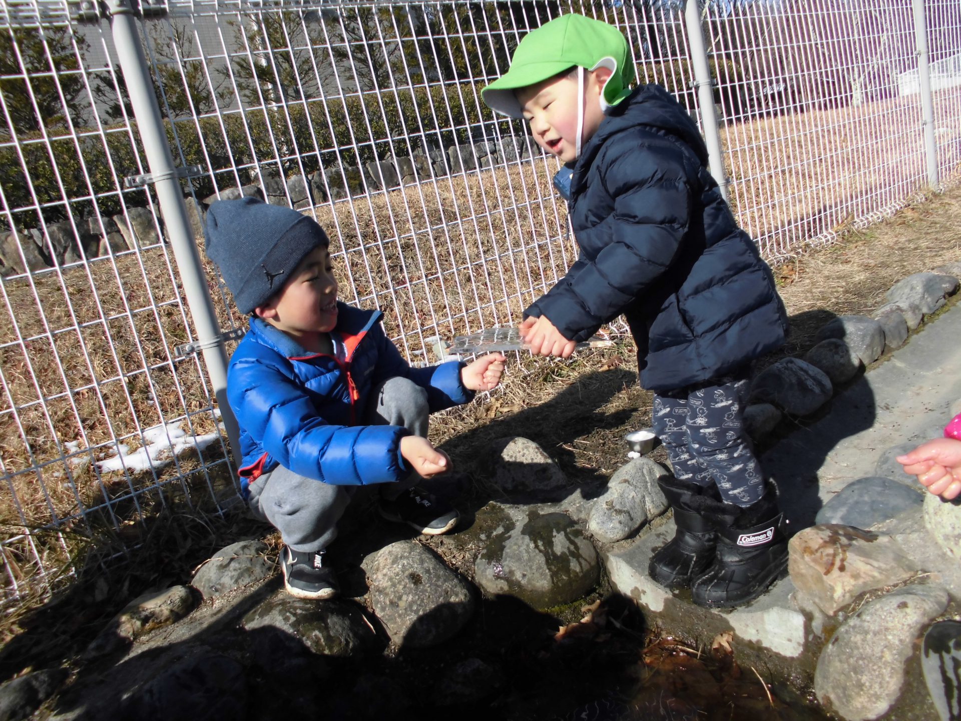 園庭にうっすらとわずかに積もった雪や氷、池の水の冷たさを観たり触れたり遊びに取り入れて楽しむことができました。