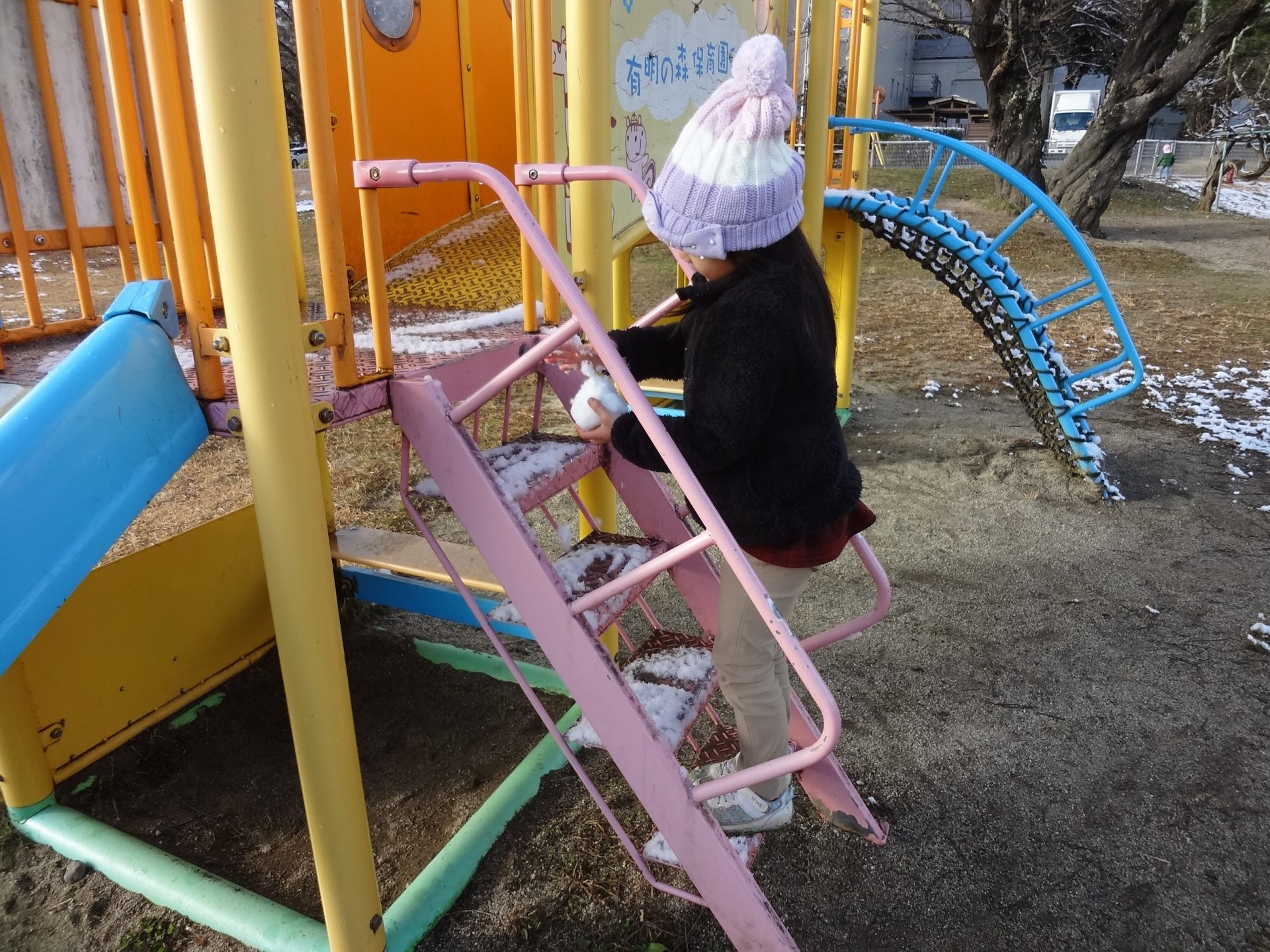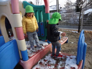 「やった!ゆきあるよ。」「早くいってみようよ。」 登園するとすぐに園庭に遊びに出てみました。