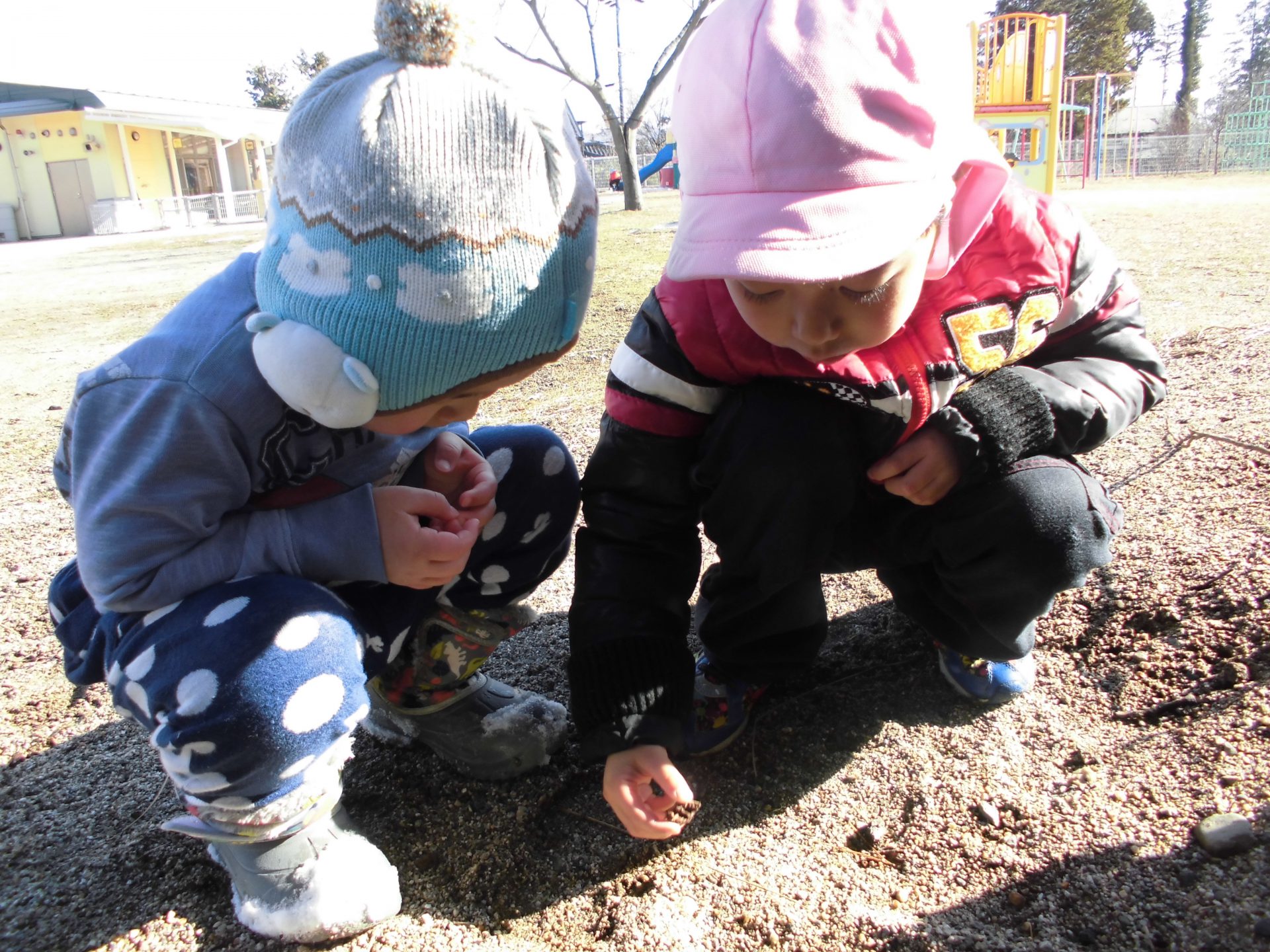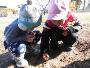 年齢によって自然への目の向け方や意識に違いがあることを改めて感じました。子どもたちは日々多くのことを見たり聞いたりして自分の知識や経験値を蓄えていると感じます。それらを友だちと共有したり、年上の子が年下の子に見せたり聞かせたりと関わりながら遊び成長していけるこの環境をこれからも大切にしていきたいと思います。