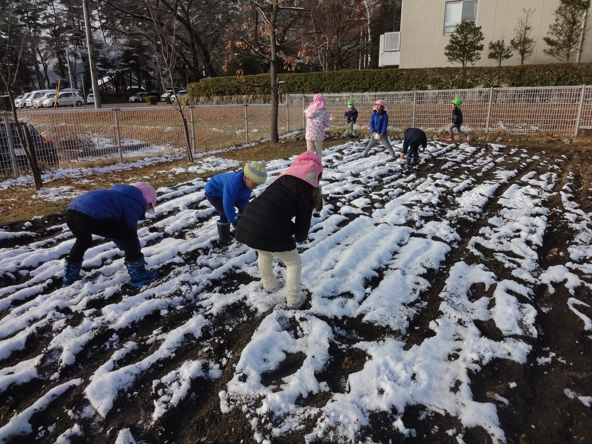 1月のはじめ。待ちに待っていた雪が、うっすらと園庭に積もっていることに気づいた子どもたち。