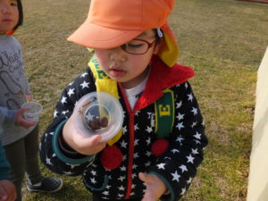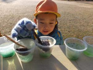 「せんせー、ぽぽのたねまだあったー。これ水にいれたらこおるかなぁ?」