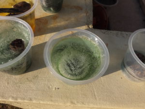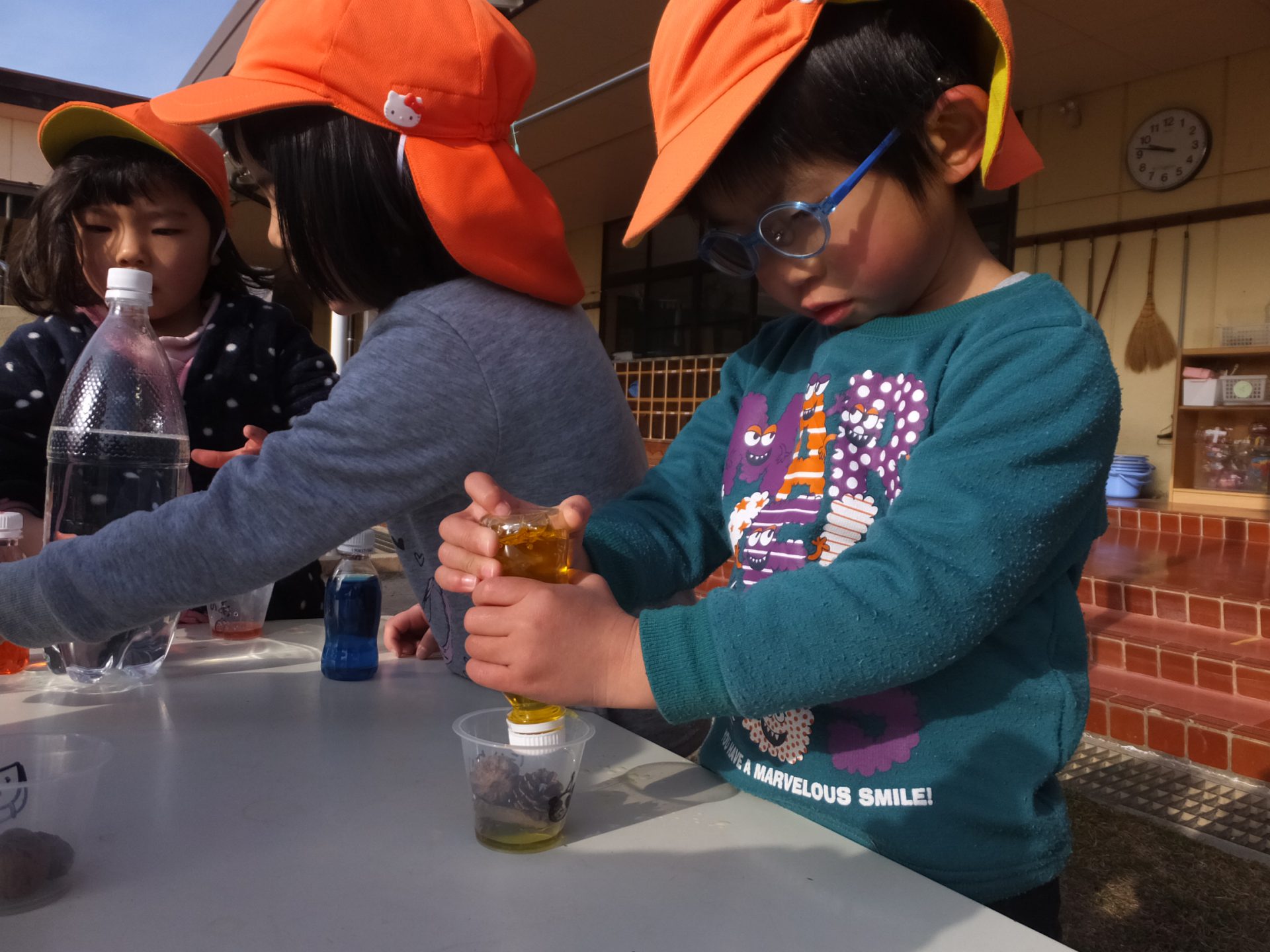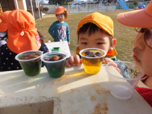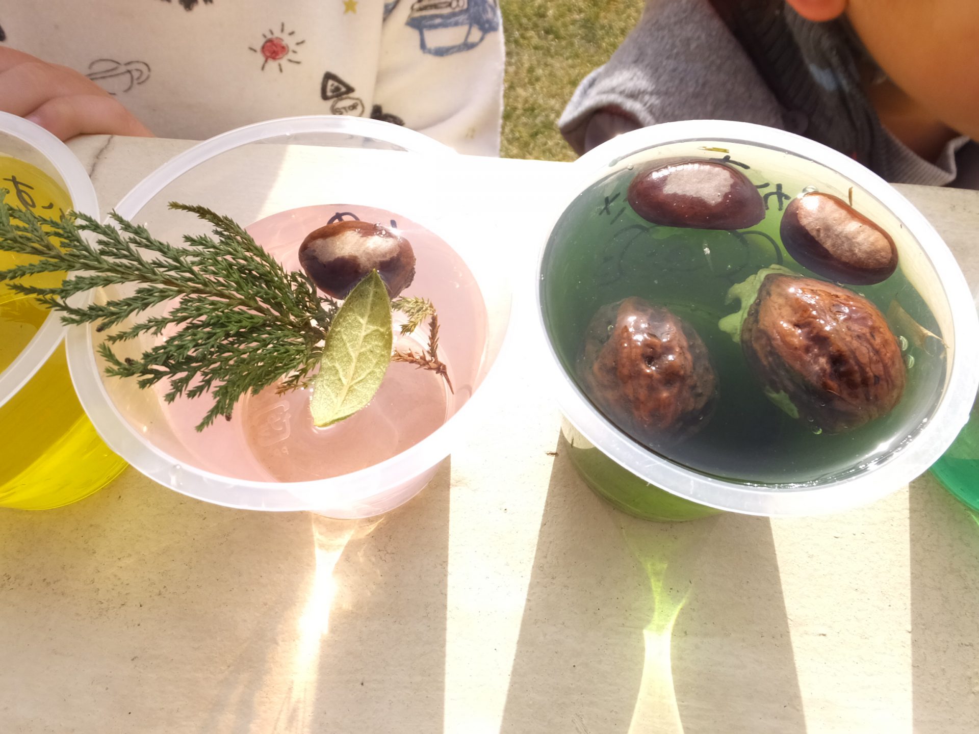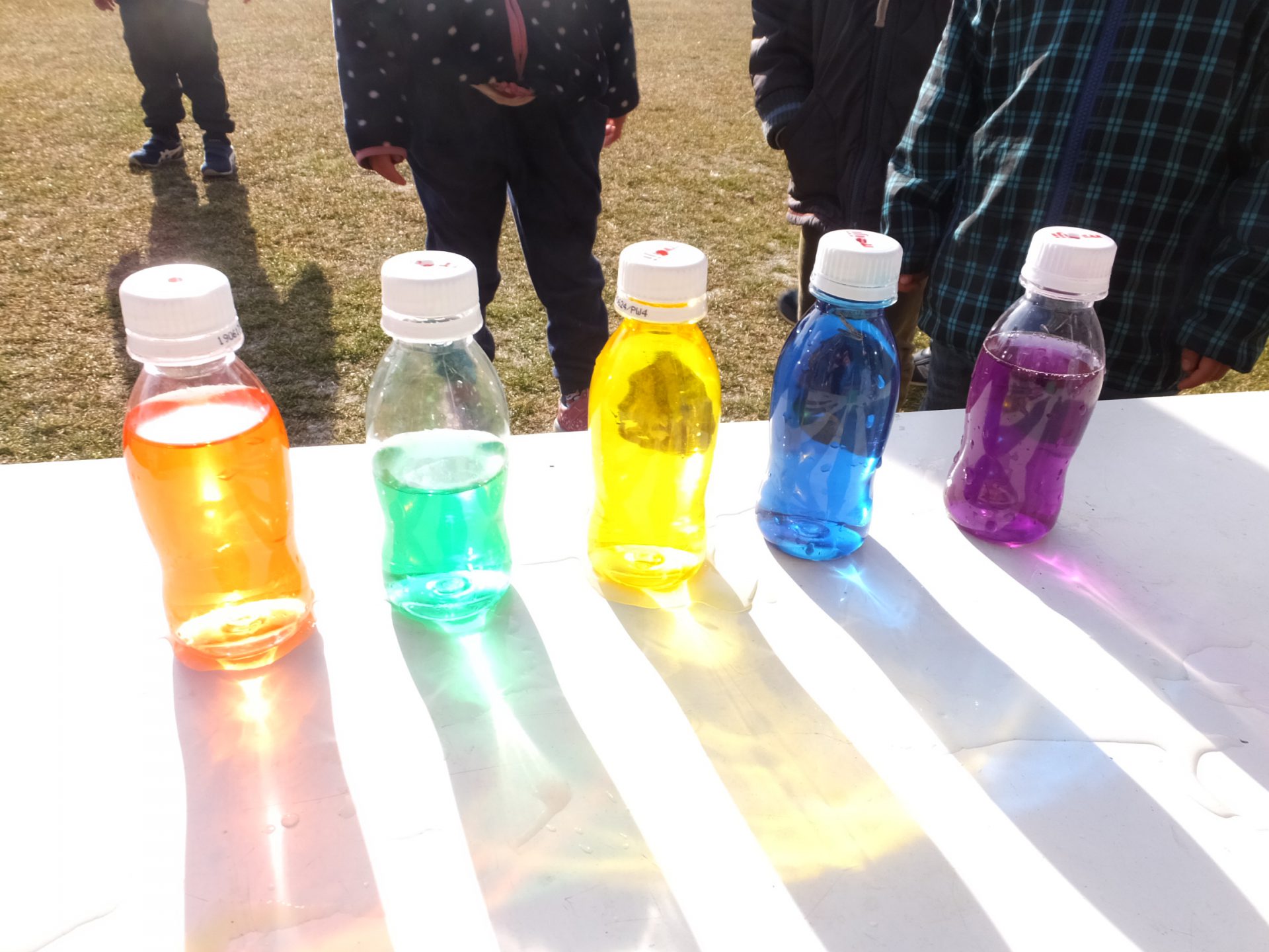 「スライムのときの水、使いたーい!」ということで、急遽、食紅での色水を用意して並べてみると、お日様の光が通りとってもきれいです。
