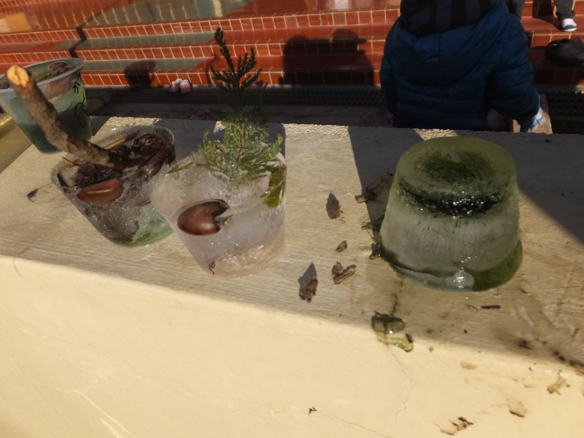 外の水道のところに置かれたコップをのぞくのが、朝の日課になったある日・・・・凍ってる!