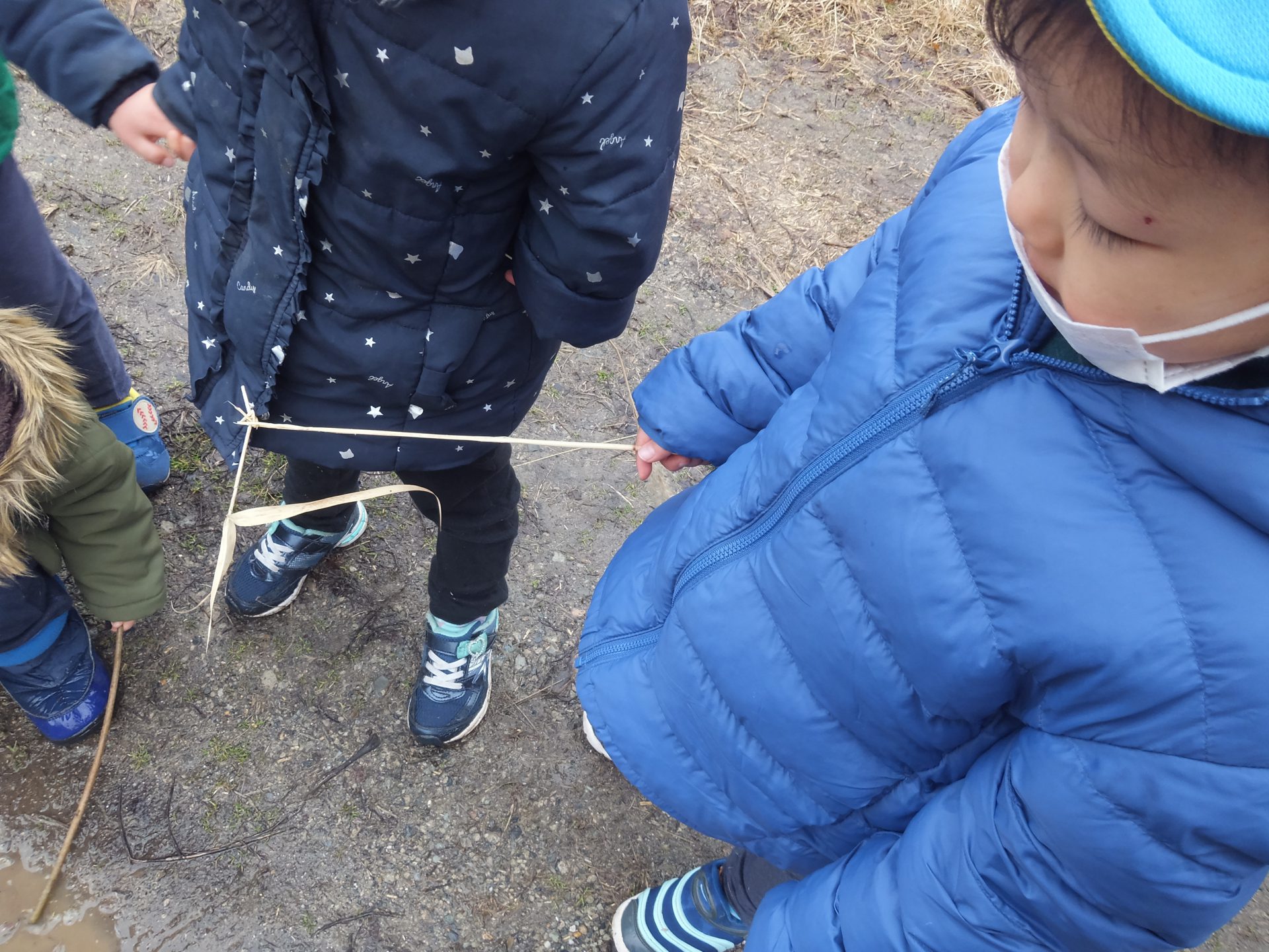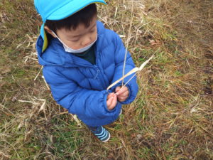 年中さんが枯れ草で釣りざおを作ったのを見て、「僕も作りたい!」と年少のA君。