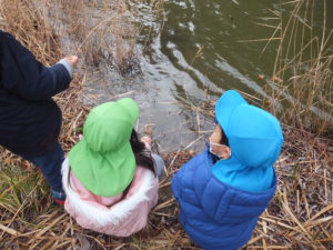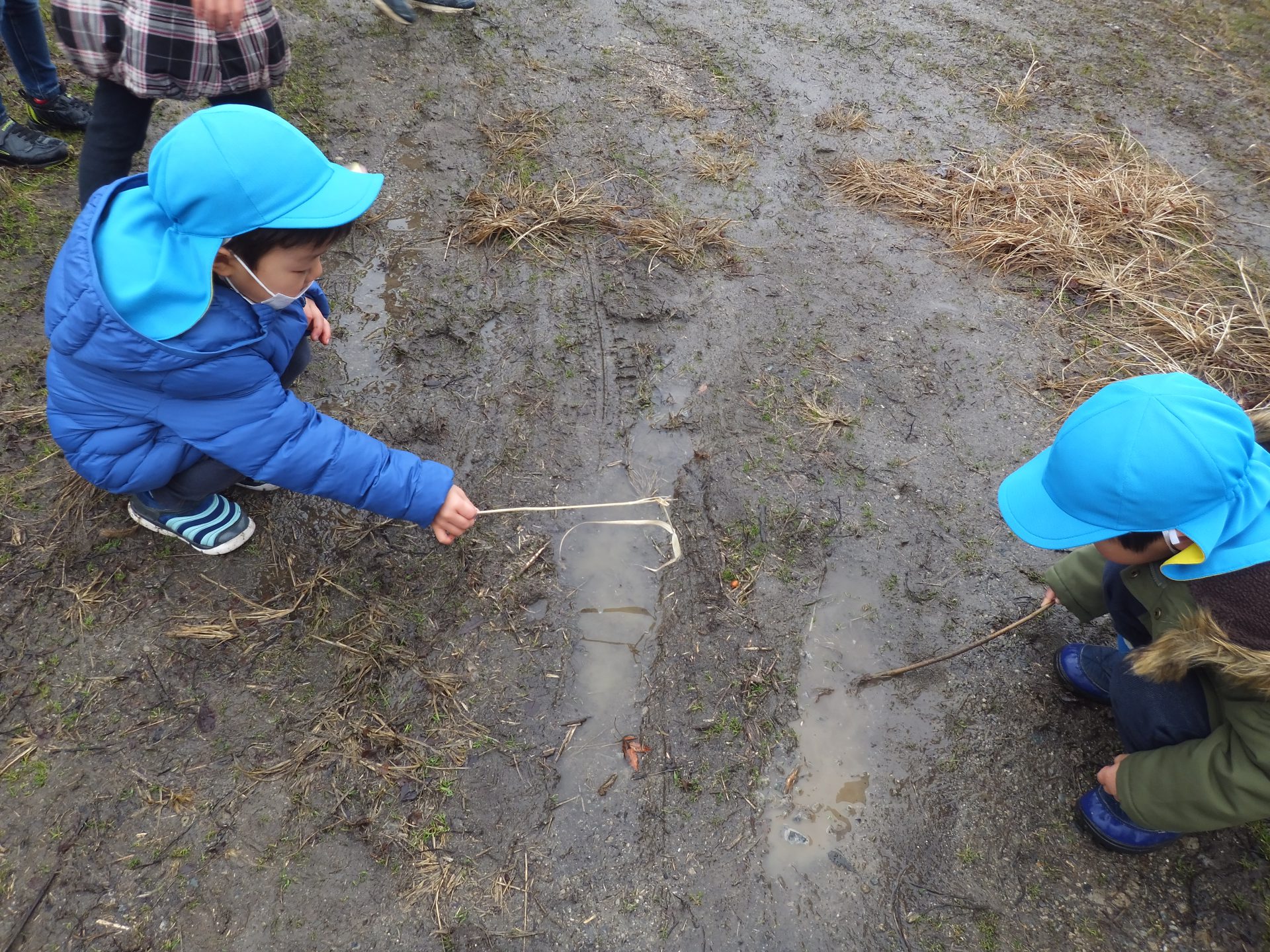 「釣れるかな?」水たまりで釣りごっこが始まりました。