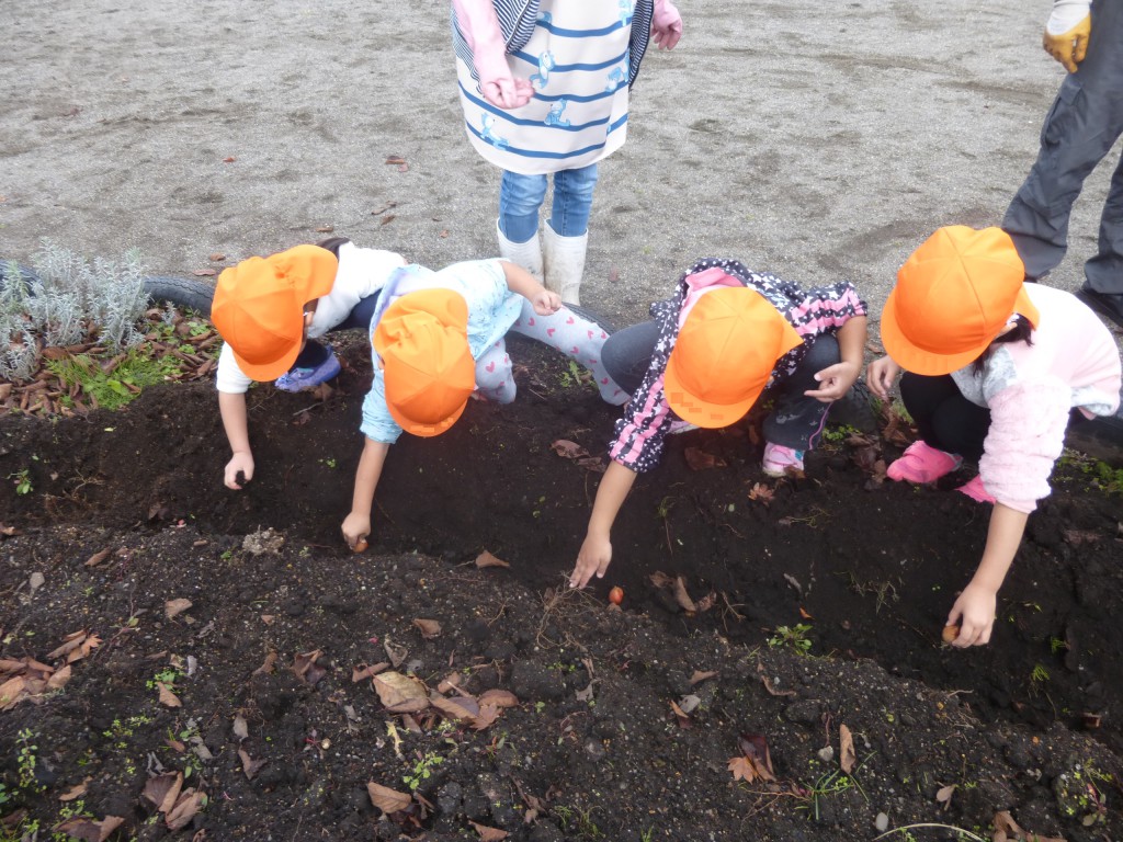 今日植えた球根はすぐには芽を出しませんが、来年子ども達が年長さんになった時に、きれいなチューリップが咲くことを楽しみにしていきたいと思います。