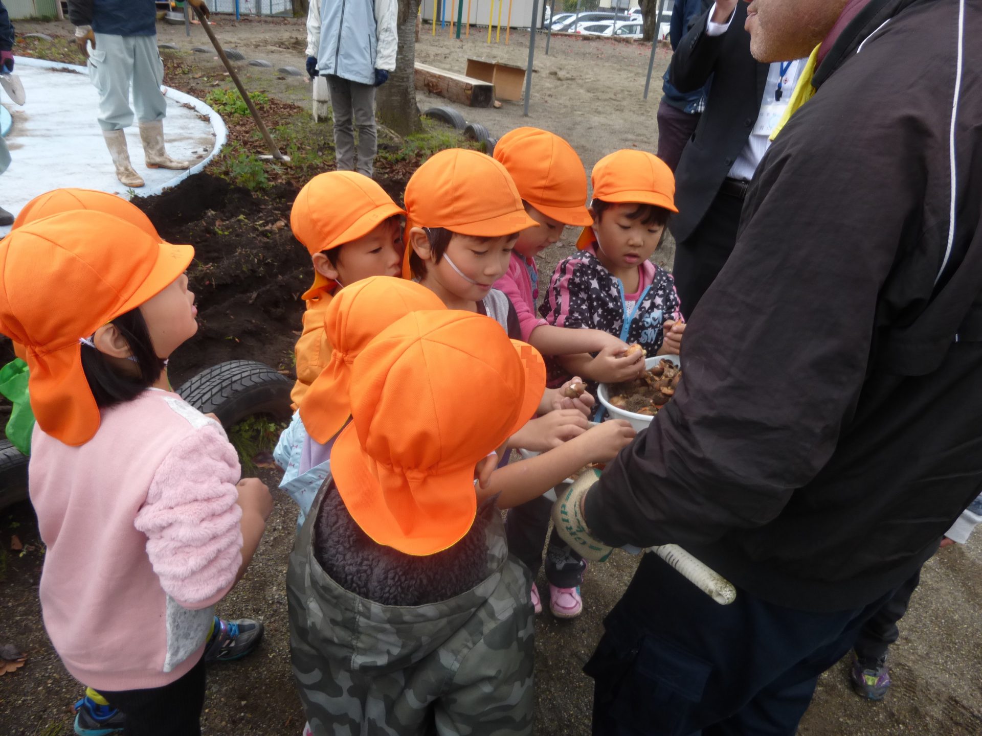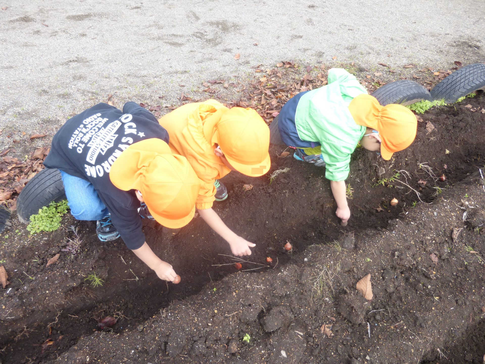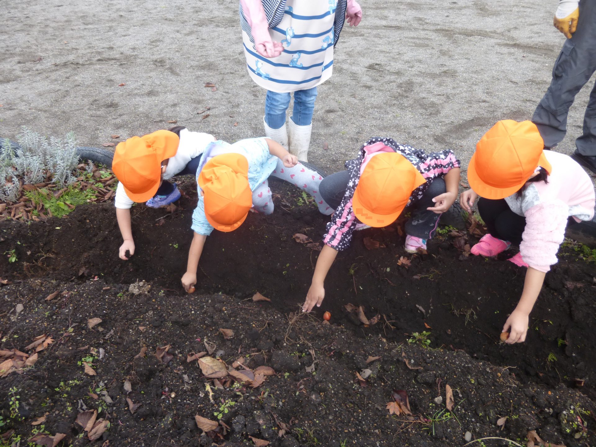 そして腕まくりをして、準備完了した子ども達は早速球根を取りに行っていました。