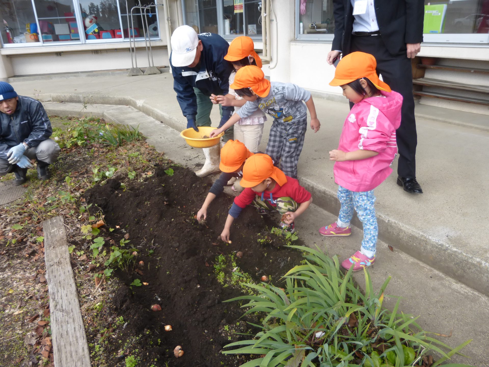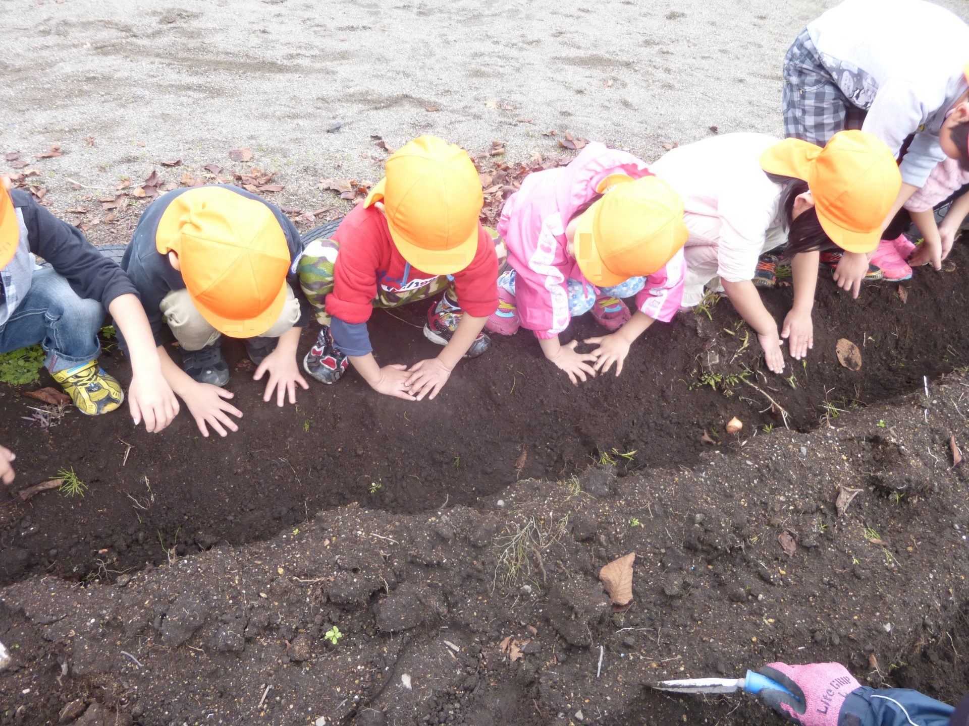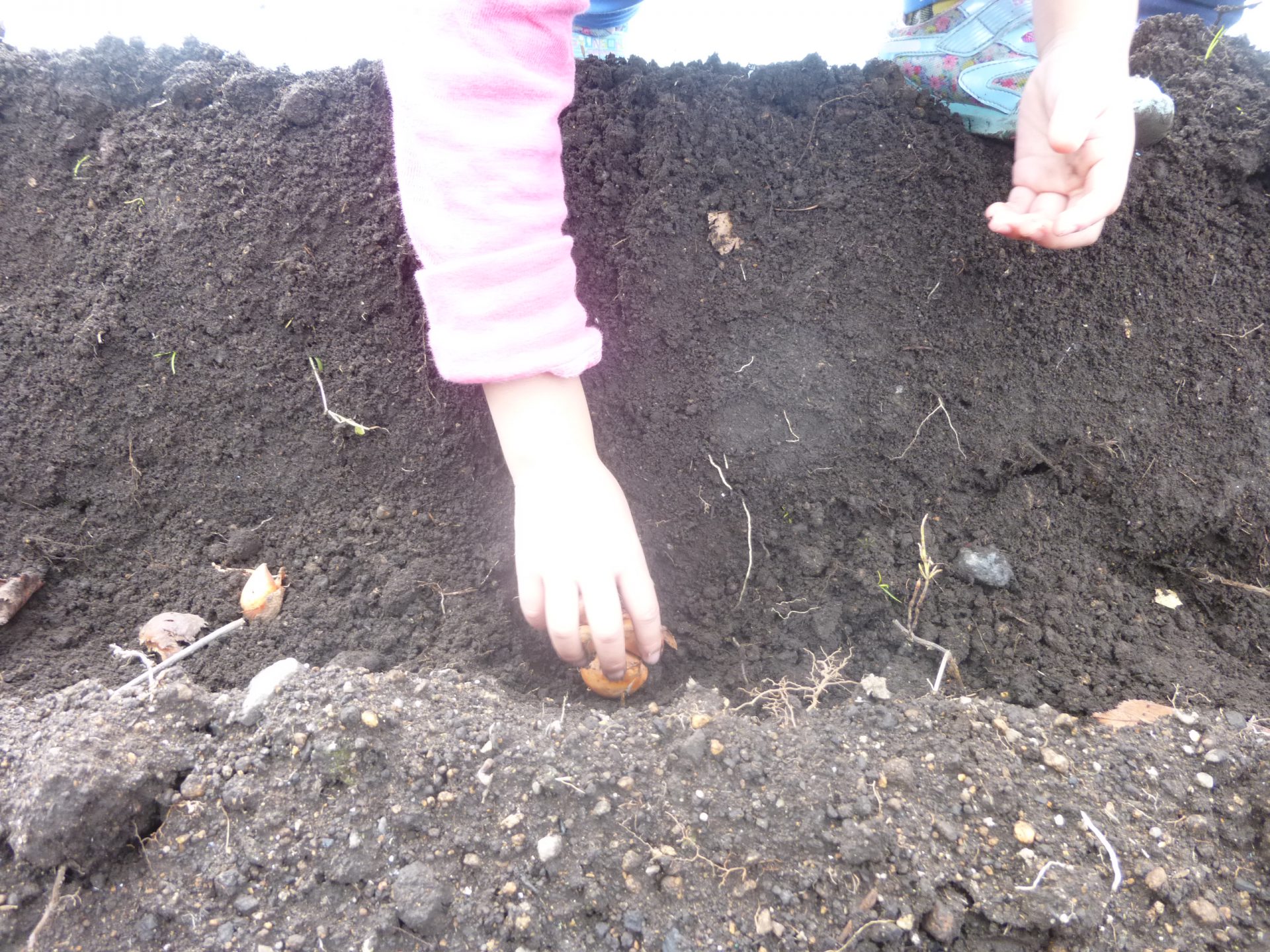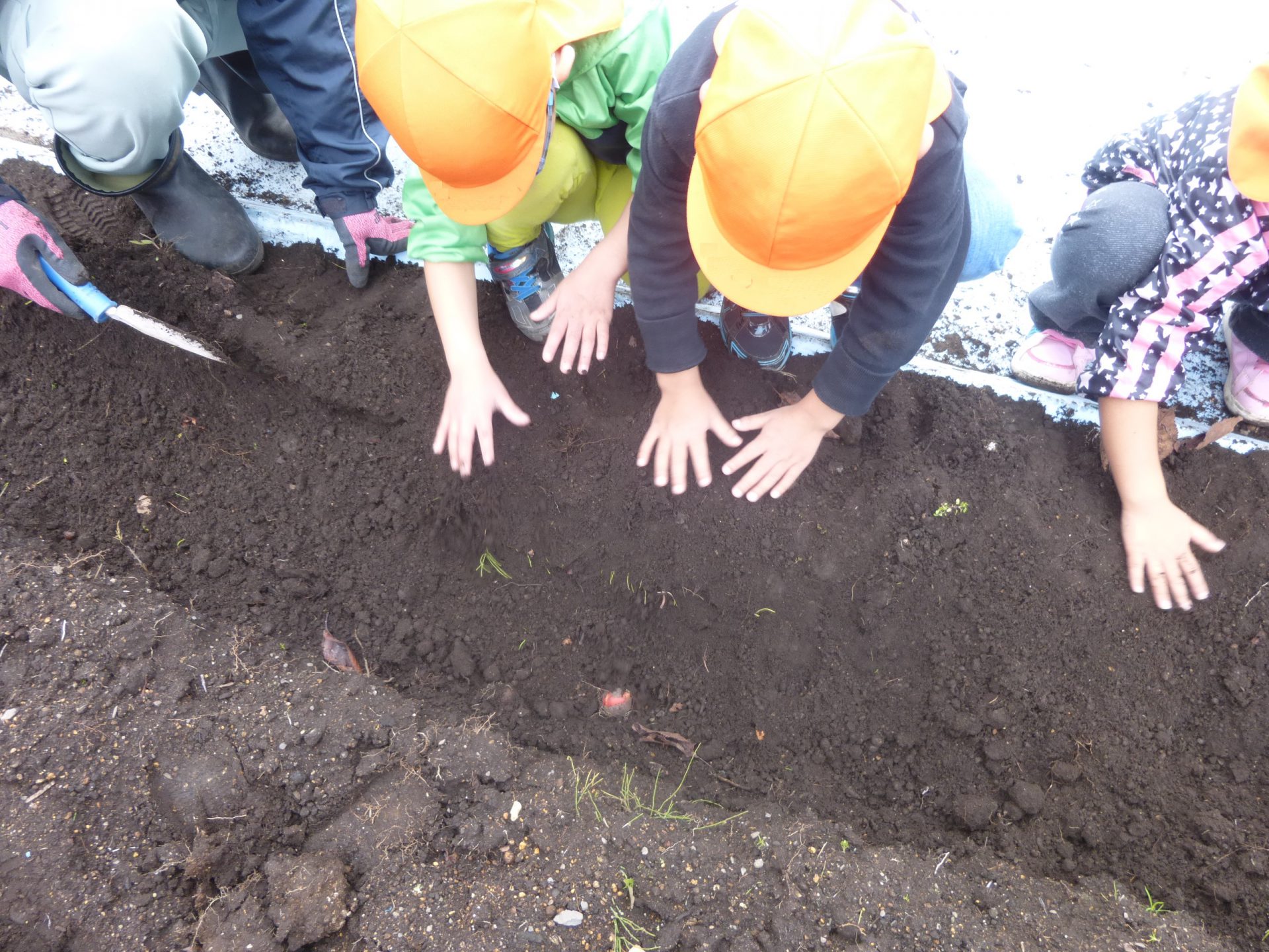 初めのうちはこれでいいのかな・・・と心配そうな様子が見られ、そーっと優しく球根を土の上に置いていました。
