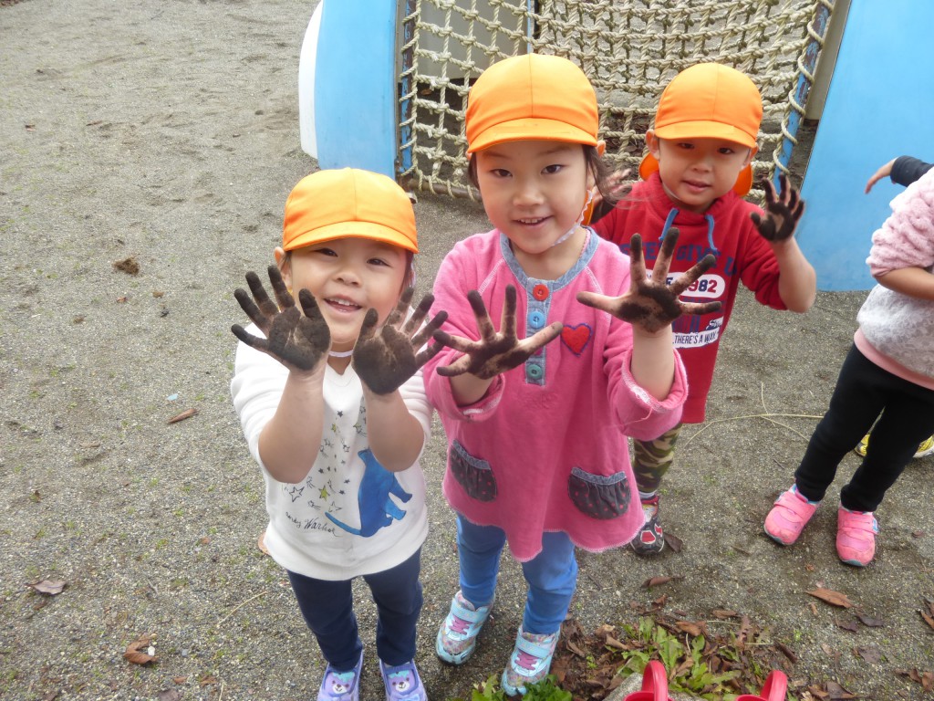 土のお布団をかけおわると「見て~!こんな手になっちゃった!!」と言いながらたくさん頑張った手を見せてくれました。