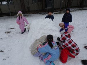 幼稚園の裏に広いグラウンドがあり、年少組の子どもたちがふかふかの雪の上を走りまわったり、雪だるま作り、かまくら作りを楽しんでいました。