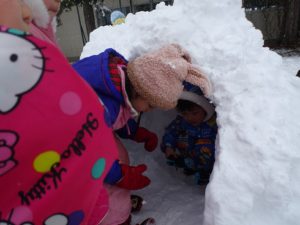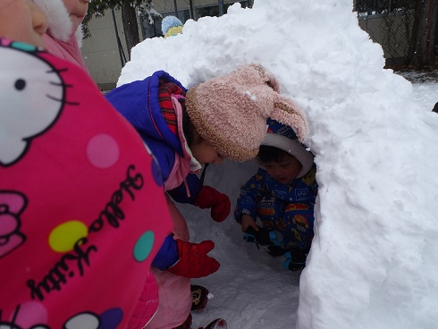 久々の雪遊び、子どもたちも張り切って準備をして、思い思いに雪遊びを楽しむ姿が見られました。「雪のお家を作りたい」という子がいて、かまくら作りを始めたところ、たくさんの子どもたちがやってきて、一緒に雪を運んだり、固めたりしながらかまくらを作りました。完成すると、ぎゅうぎゅうになりながら順番に中に入っていた子どもたちがとってもかわいかったです。