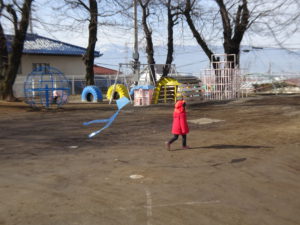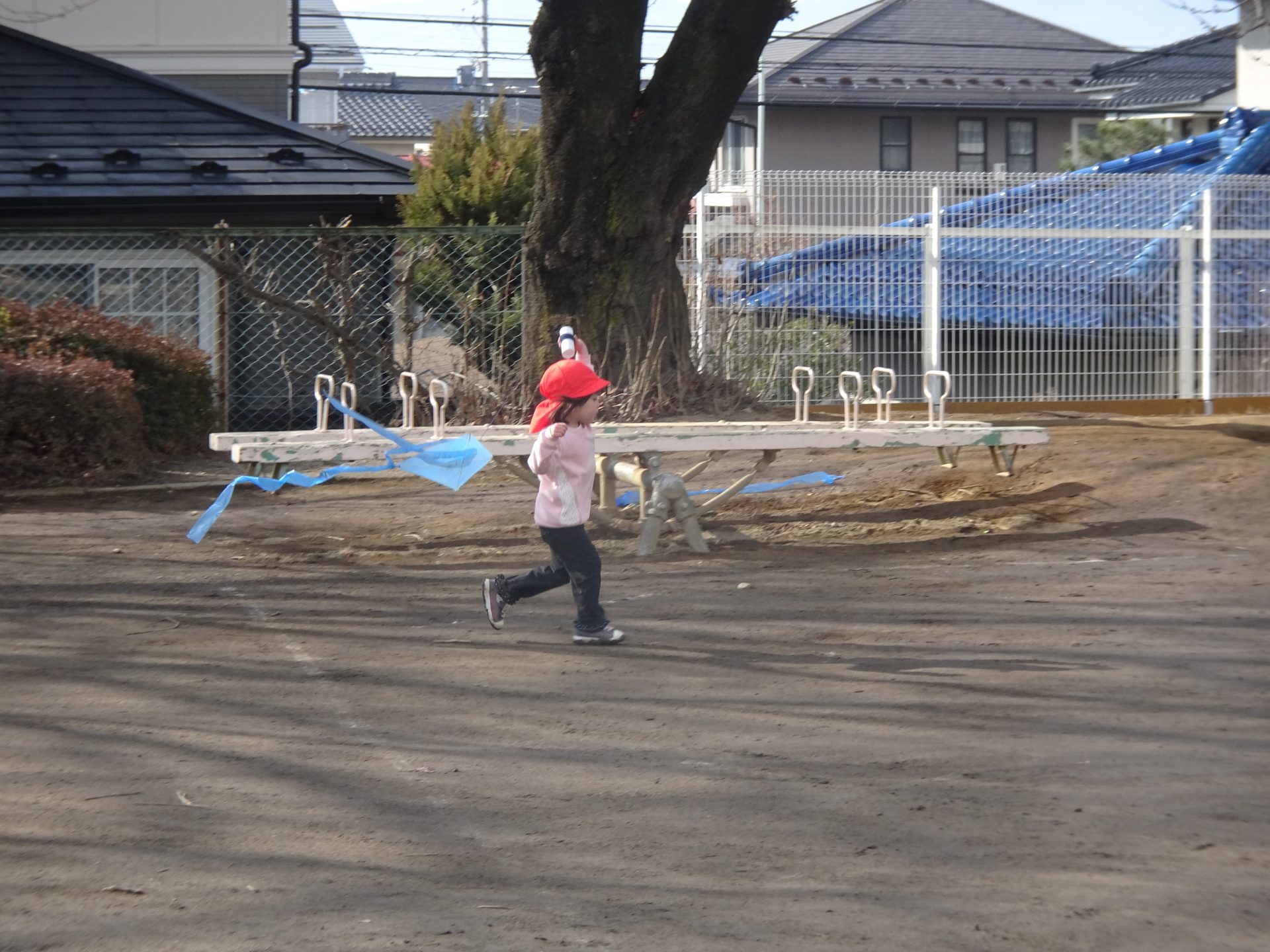 風が吹く方向や、走る速度、実際にやって見ながら工夫している年長さんの姿がありました。年少さんは、年長さんのやっていることがうらやましくて、見よう見まねでたこをしていました。年長さんが年少さんお面倒を見てくれたりもして、異年齢での関わり合いも見られました。