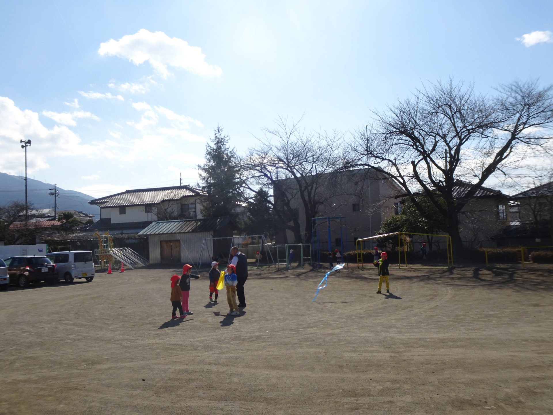 1月は、天気のいい日には園庭に出て、凧あげをして遊ぶ姿が多く見られました。バスの運転手さんが、お手製の凧を作り、子どもたちと一緒に園庭であげていました。年長さんは自分で上手にあげ、年中、年少さんは真似をしながら楽しんでいました。