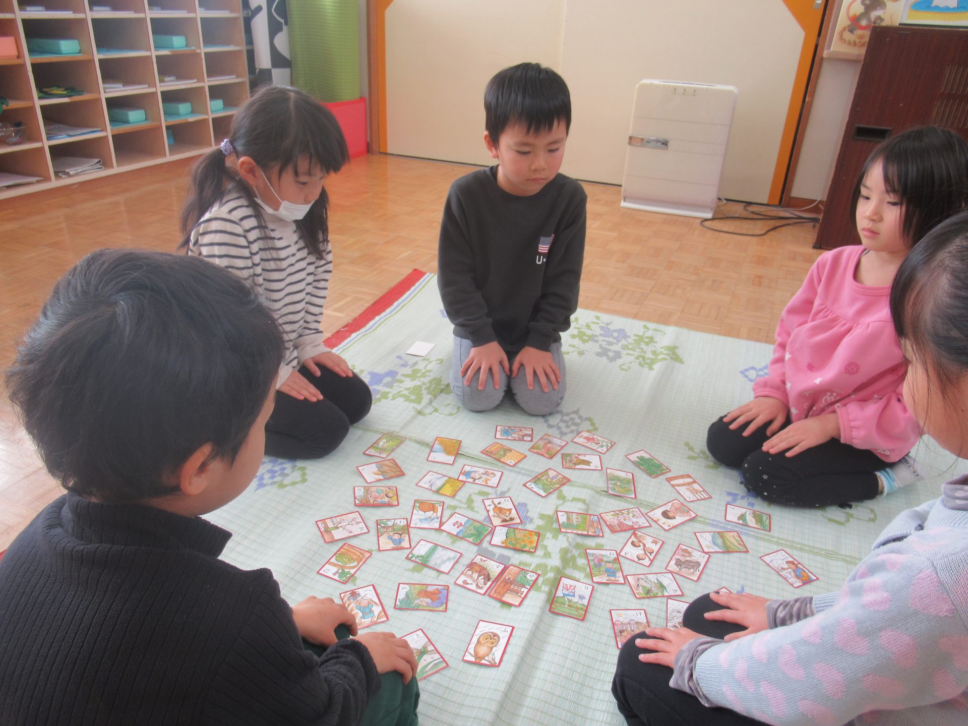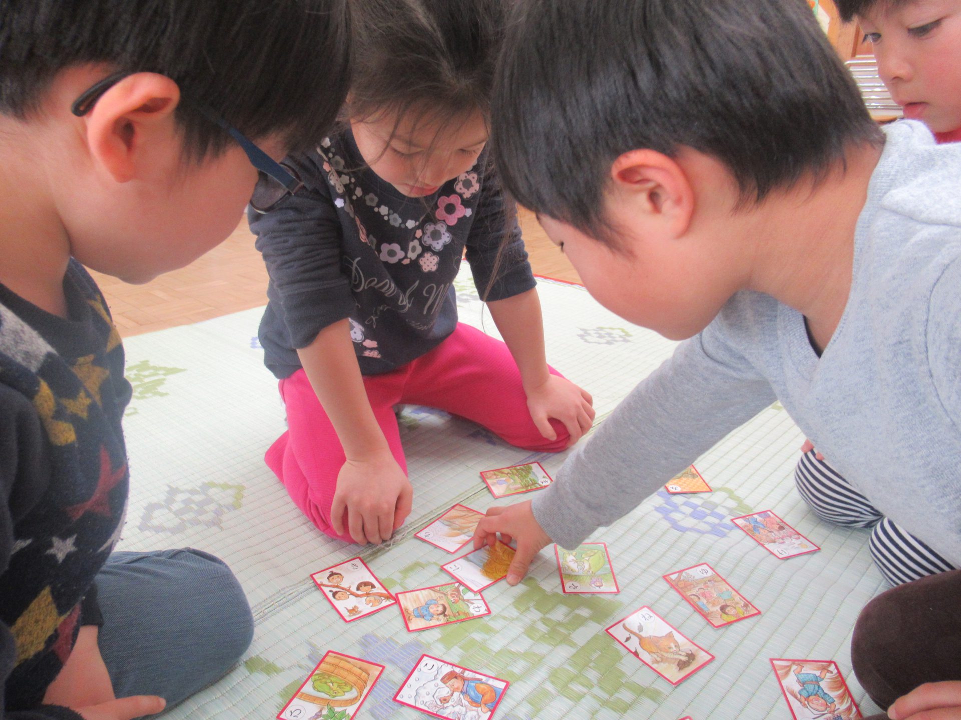 一茶かるたの絵札を見ただけで、読み札となる俳句を話してくれるお友達の姿!!。きっと給食の俳句献立で触れたり、かるた遊びで親しんだりした経験があったからかなと思います。また、「一茶かるた、持ってるよ!!」と教えてくれるお友達もいて、身近に一茶かるたや一茶さんのことを感じているようでした。自分たちが住んでいる地域やゆかりのある人物を知る中で、地域を知り深めていってほしいなと思いました。