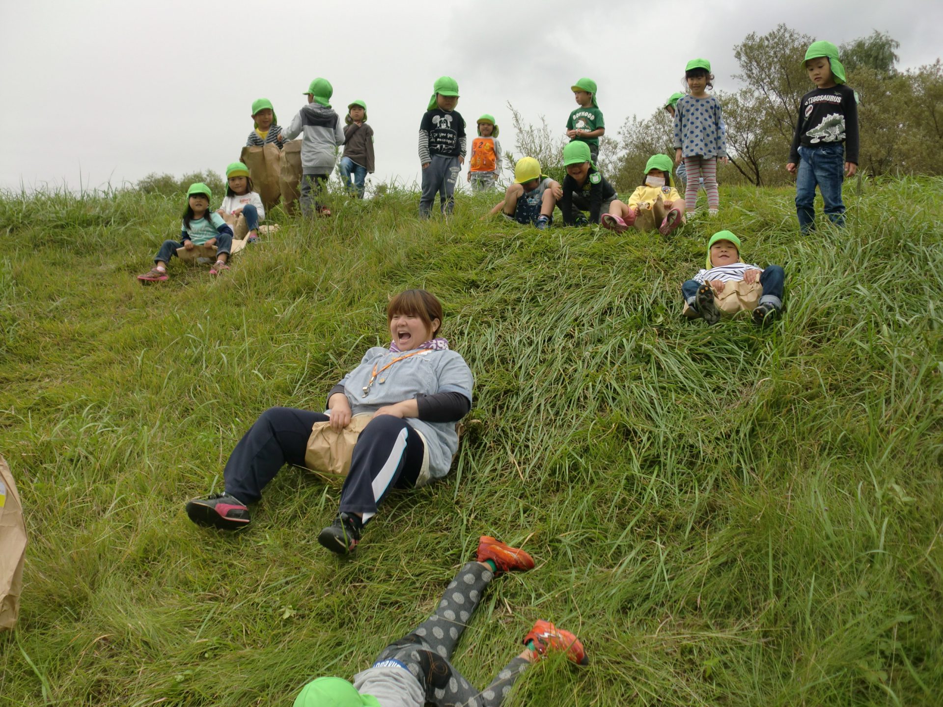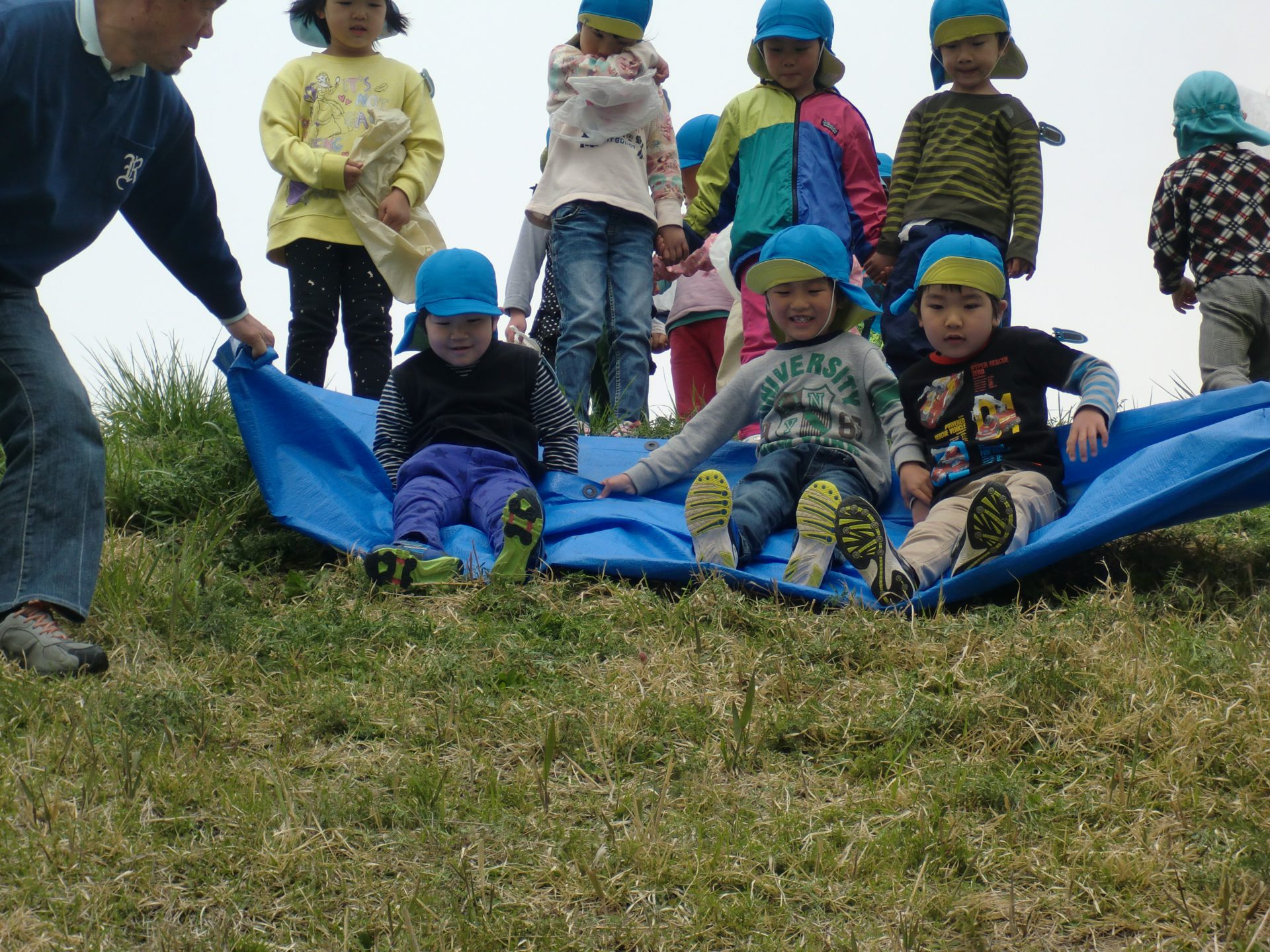 春にも挑戦した土手すべり。保育園では恒例となっていますが、滑りにくい素材で一度