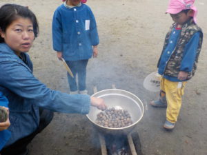 収穫祭当日(11月29日)は、朝から園庭に火をおこし、お部屋には朝早くから焚いたご飯を「半殺し」(すりこ木で荒く潰したもの)にして、五平餅つくり開始。