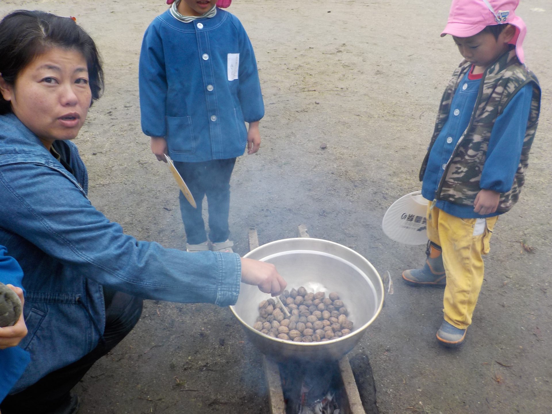子ども達が山に遊びに行ったとき、くるみを見つけ沢山拾って来たので、「これ五平餅に使えるよ。」と教えると喜んで、クルミ抜きも手伝ってくれました。
