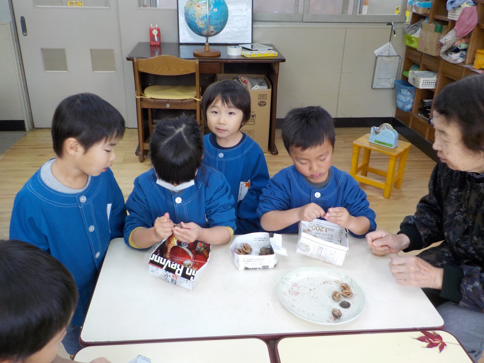 ちょうど、あやめグループホームのおばあちゃんたちも来ていて、一緒にクルミを抜きました。「懐かしいなー。」と言っていました。