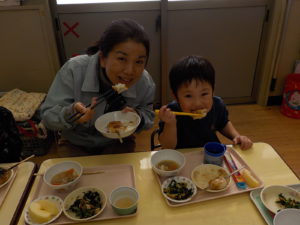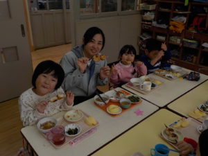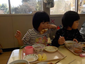 みんな、大きな口を開けてかぶりついています。1串ずつ配ったのですが、「もう1本!」と、おかわりを何度もしていました。