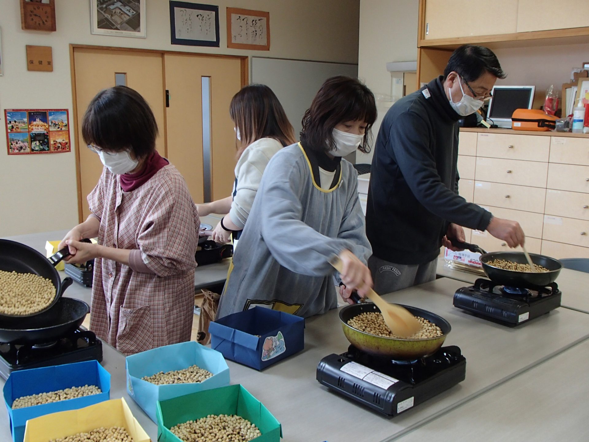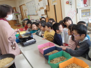 今日は『豆まき会』。職員が豆を炒り、いい匂いが漂っていきます。