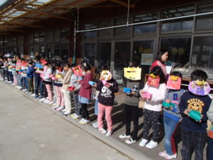 テラスに出て豆まきの始まりです。作ったお面も被り、張り切っています。