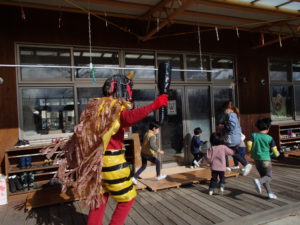 逃げていく鬼に、ほっとする子ども達。まだ、豆もあるからまこうね。