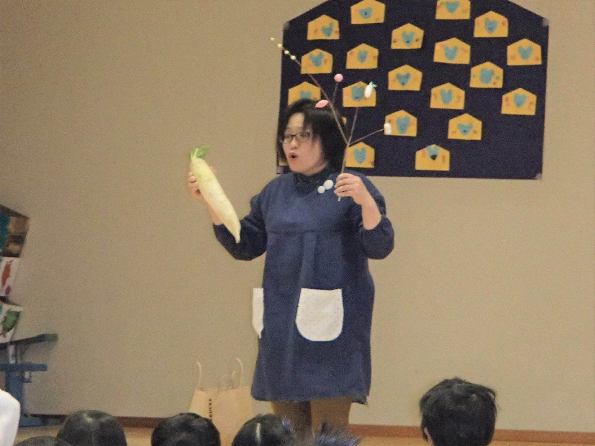 畑で採れた大根を見せながら『ものづくり』の由来を話します。「五穀豊穣」という難しい言葉も「だいこんがたくさんとれるといいね」だよねと子ども達。楽しみながら話を聞きました。