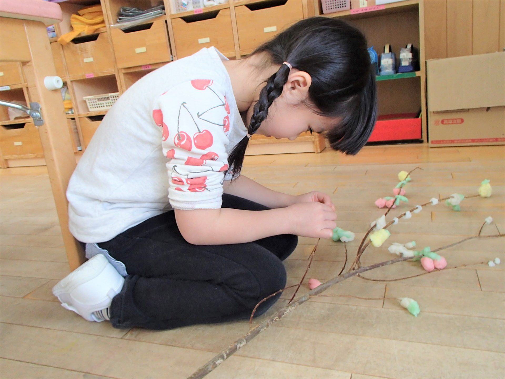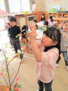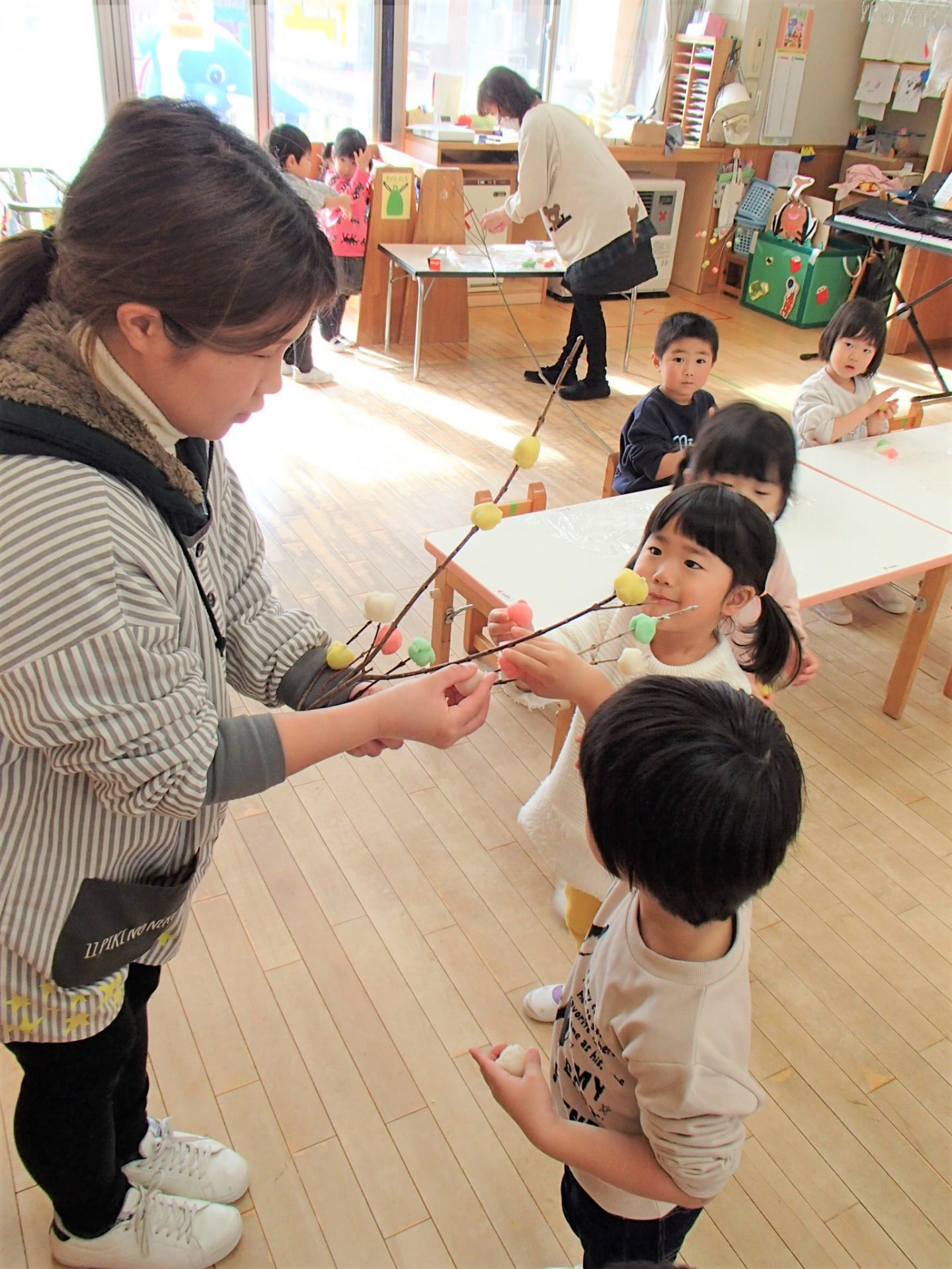 『ものづくり』は五穀豊穣を祈り、無病息災を願って行われている伝承行事ですが、家庭で経験する機会は減りつつあります。保護者の方は、子ども達が作り、色とりどりに飾られた柳を眺めながら「きれいだね。ママも作ったことあるよ」「じょうずにできたね。何作ったの?」と話をしていました。これからも、地域に伝わる行事を大切に子ども達に伝えていきたいと思います。