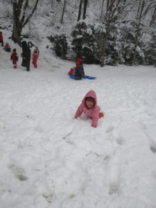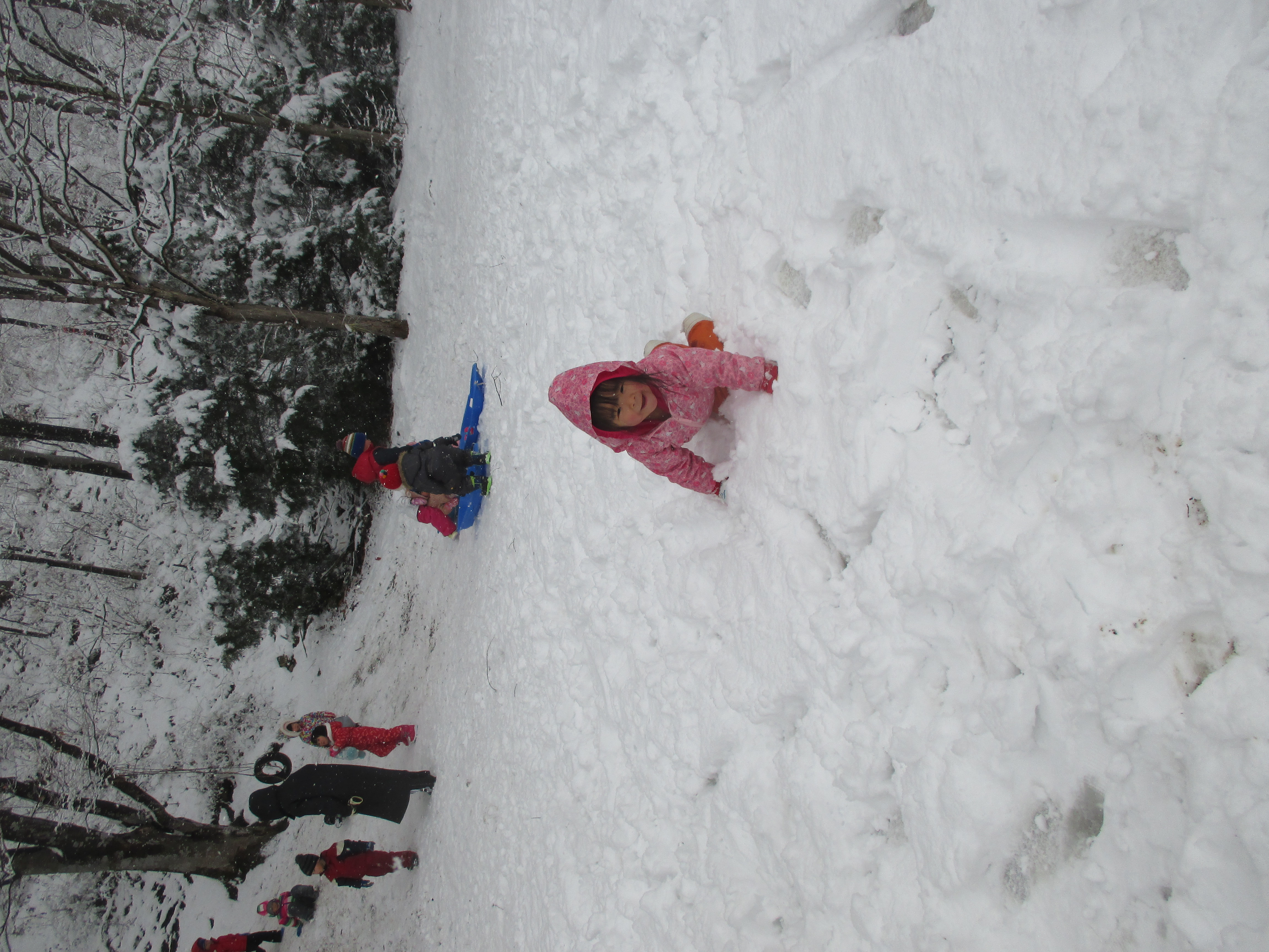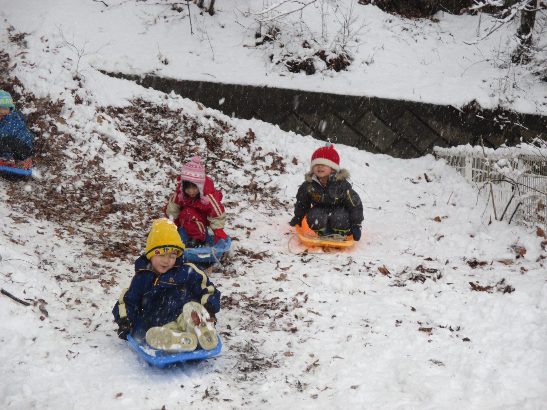 年長さんから乗り方を教えてもらい異年齢での関わりも自然と持てています。 雪が木の上から落ちてくる様子やふわふわの雪の感触も体全体で感じ、雪にたくさん触れて遊びことができた一日となりました。雪遊びを通して夢中で遊ぶ楽しさを感じて欲しいと思います。