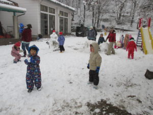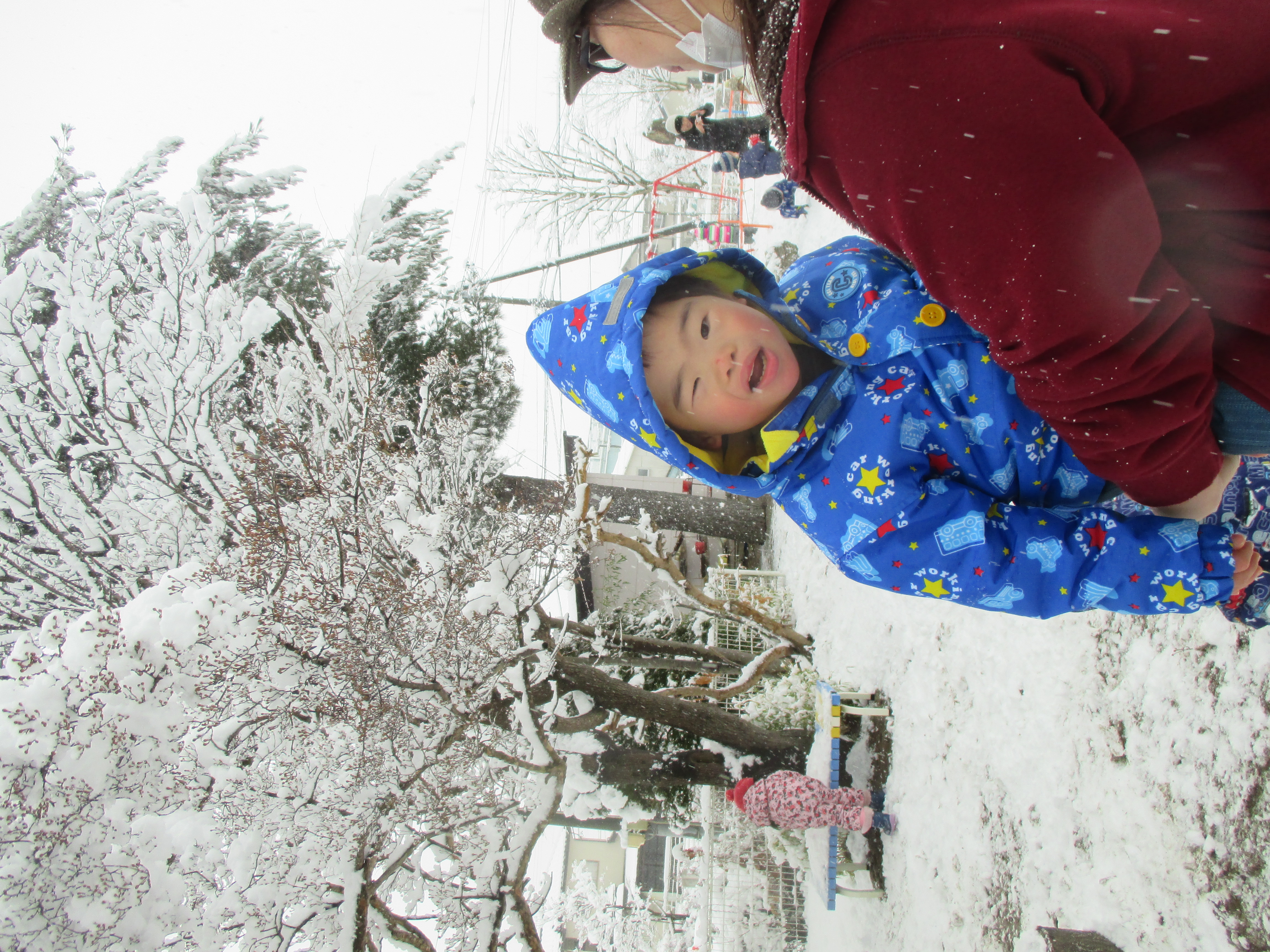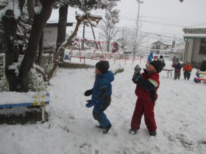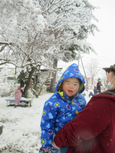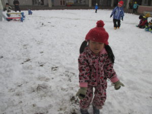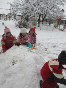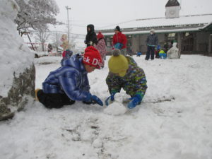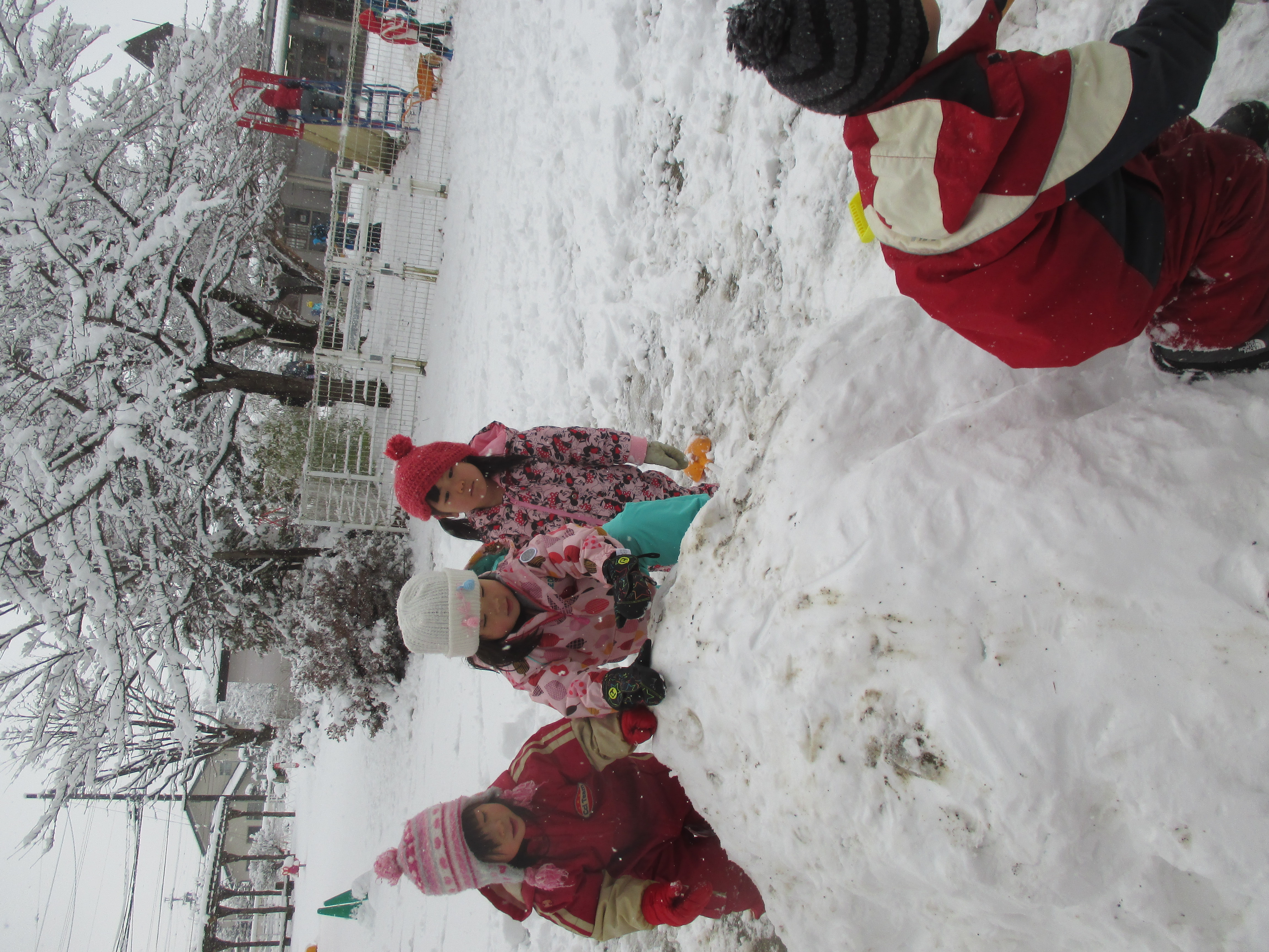 今年初めての雪、たくさんの雪に触れ思いきり遊んで欲しいと思います。雪だるまを作ったり、雪合戦や雪山を作ったりとそれぞれが雪遊びを楽しんでいます。