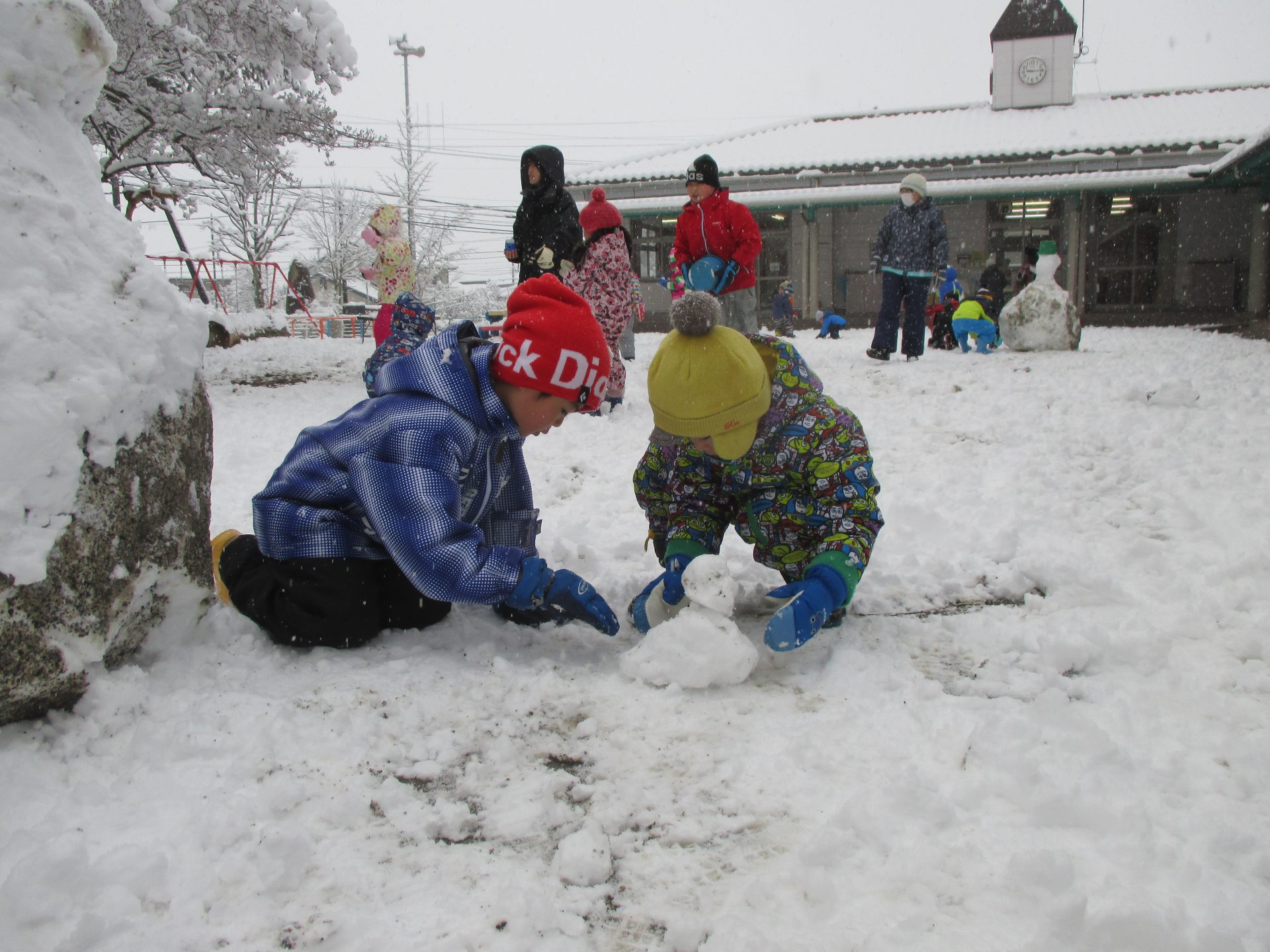 雪だるま作りは、年中のお兄さんに作り方を教えてもらいました。異年齢交流を通して大きい組さんの様子を見て刺激を受けています。何でも真似をしたい小さい組さんです。小さい雪だるまを2人で仲良く作ります。