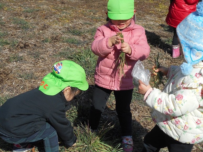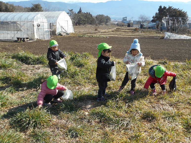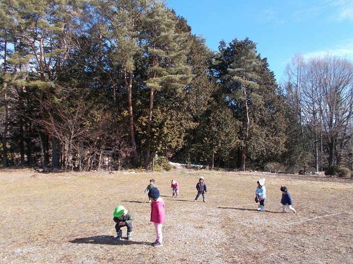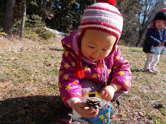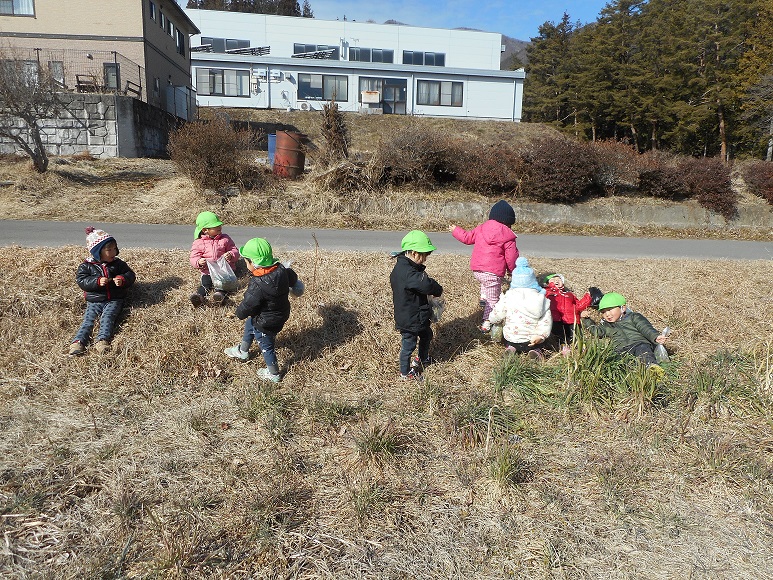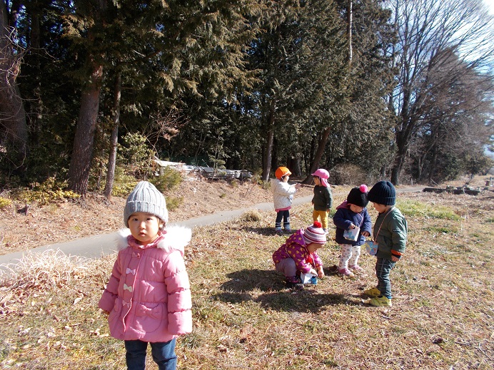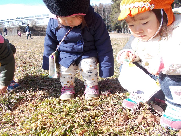 暖かい日差しに誘われて、今日も3歳未満児組は林のそばの原っぱへ散歩に出かけました。子供たちには、毎回楽しい発見があって散歩はみんな大好きです。