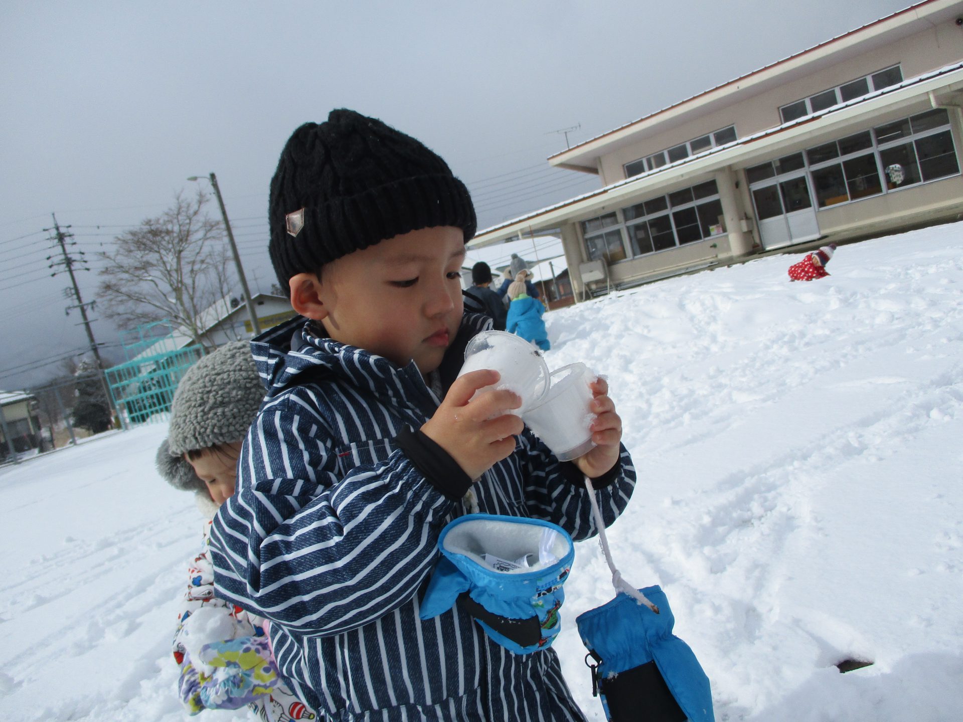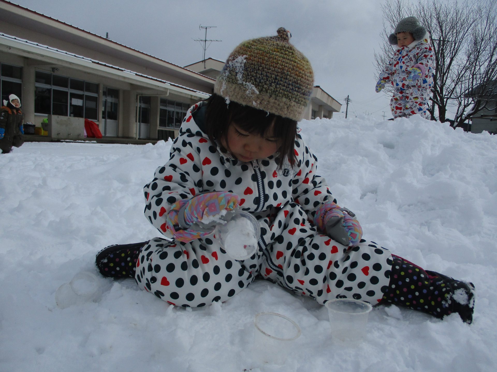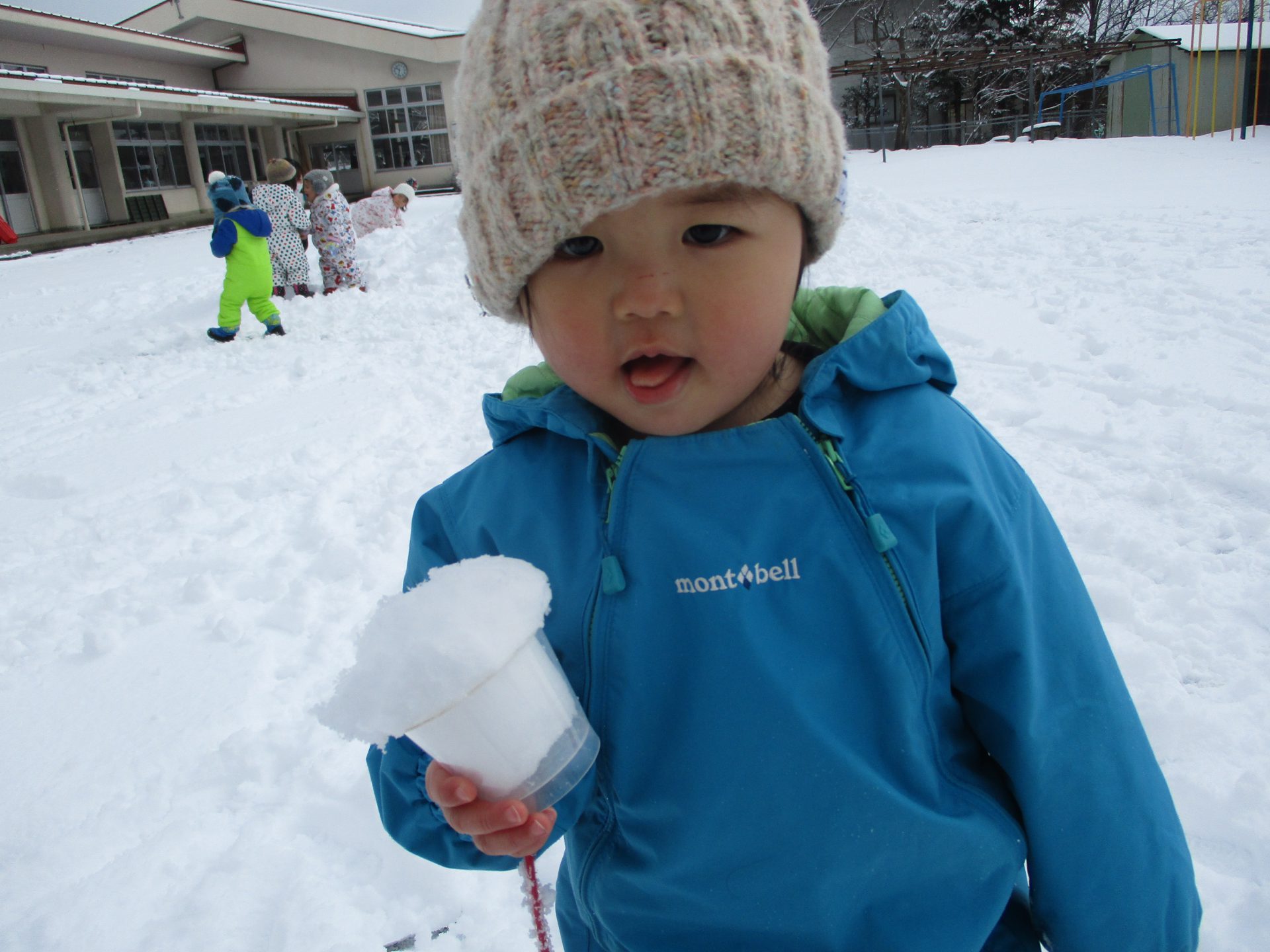 雪遊びをするなかで、何度も雪に触れ感触を確め、「つめたい」と、顔をくしゃっとして表したり自分の心と体両方で感じとる経験をしています。冷たさ、ふわふわした感触、固まったり崩れたりという変化など、その時々の気づきや気持ちを自らの感覚や感性で伝えている子ども達です。