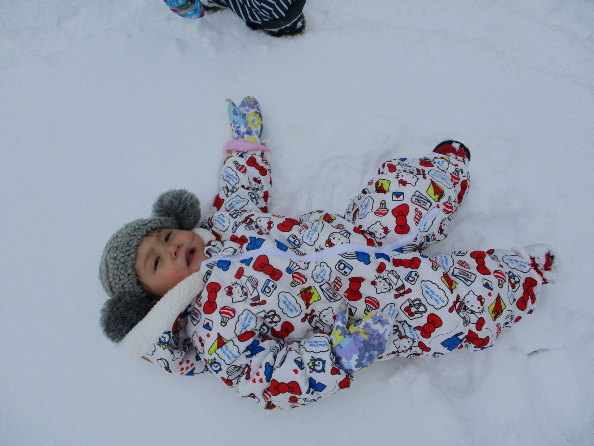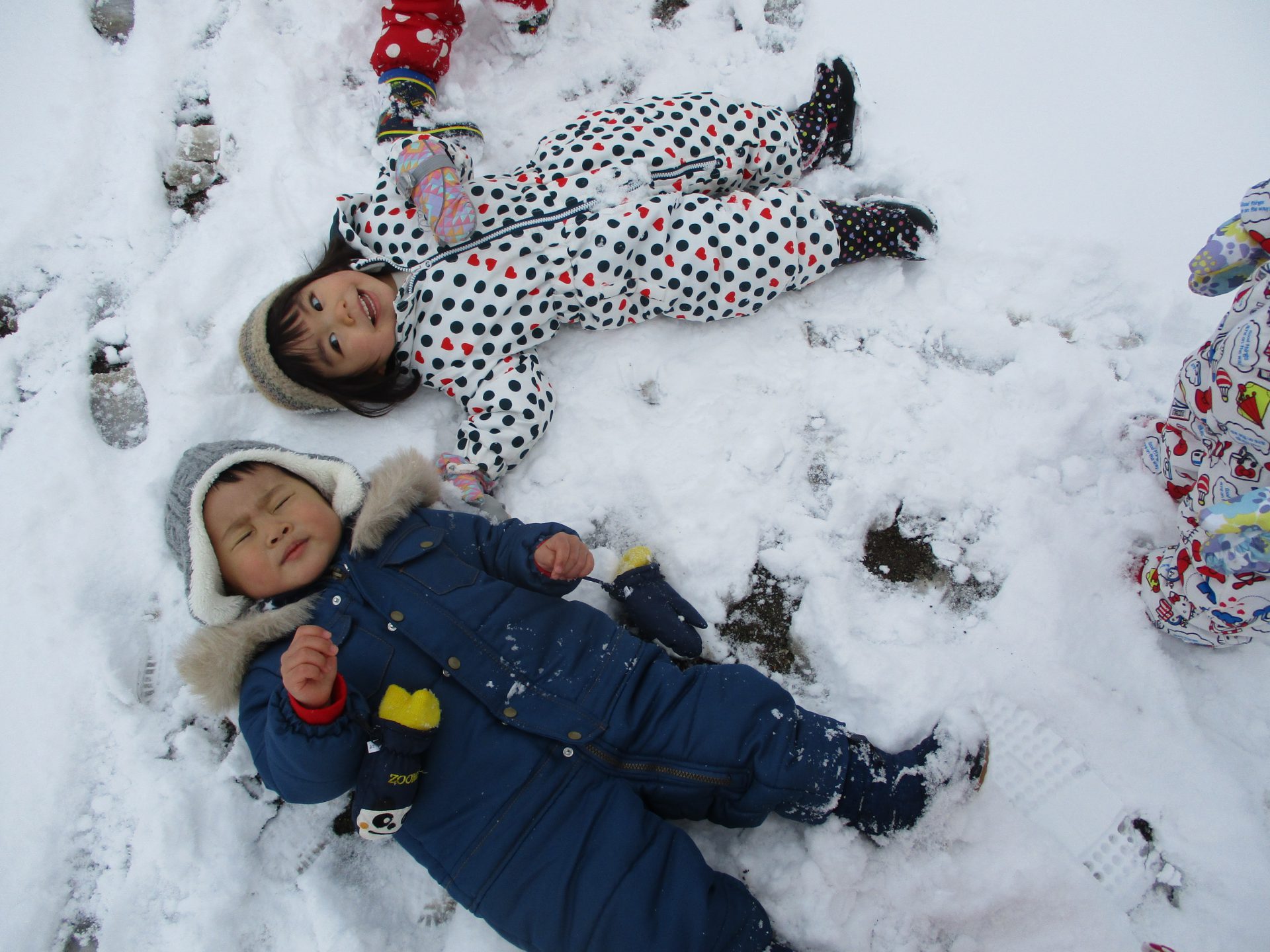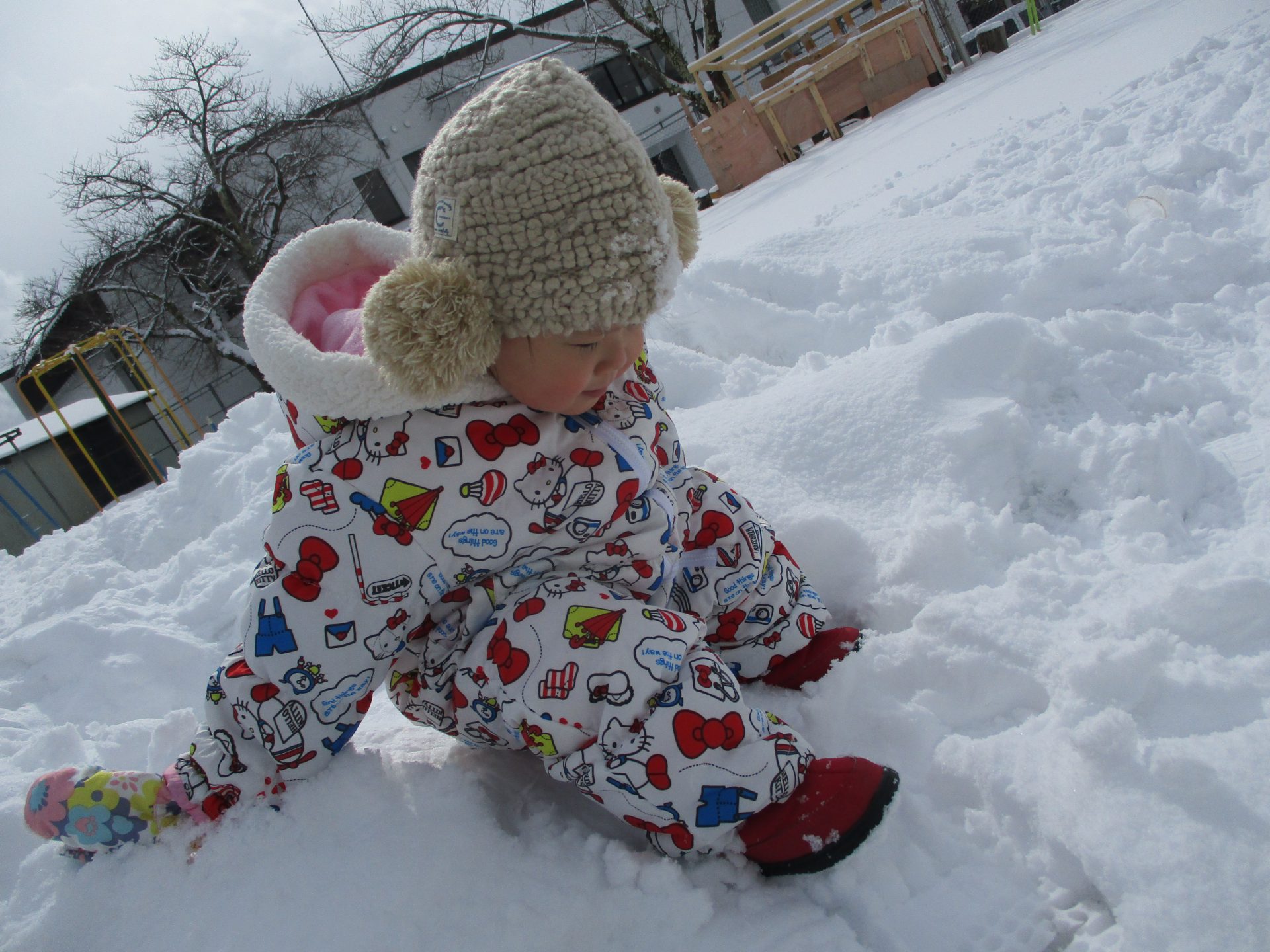 手で触れるだけでなく、体全体を使って楽しむようになってきました。安心して雪に飛び込んで遊ぶ姿に嬉しくなります!