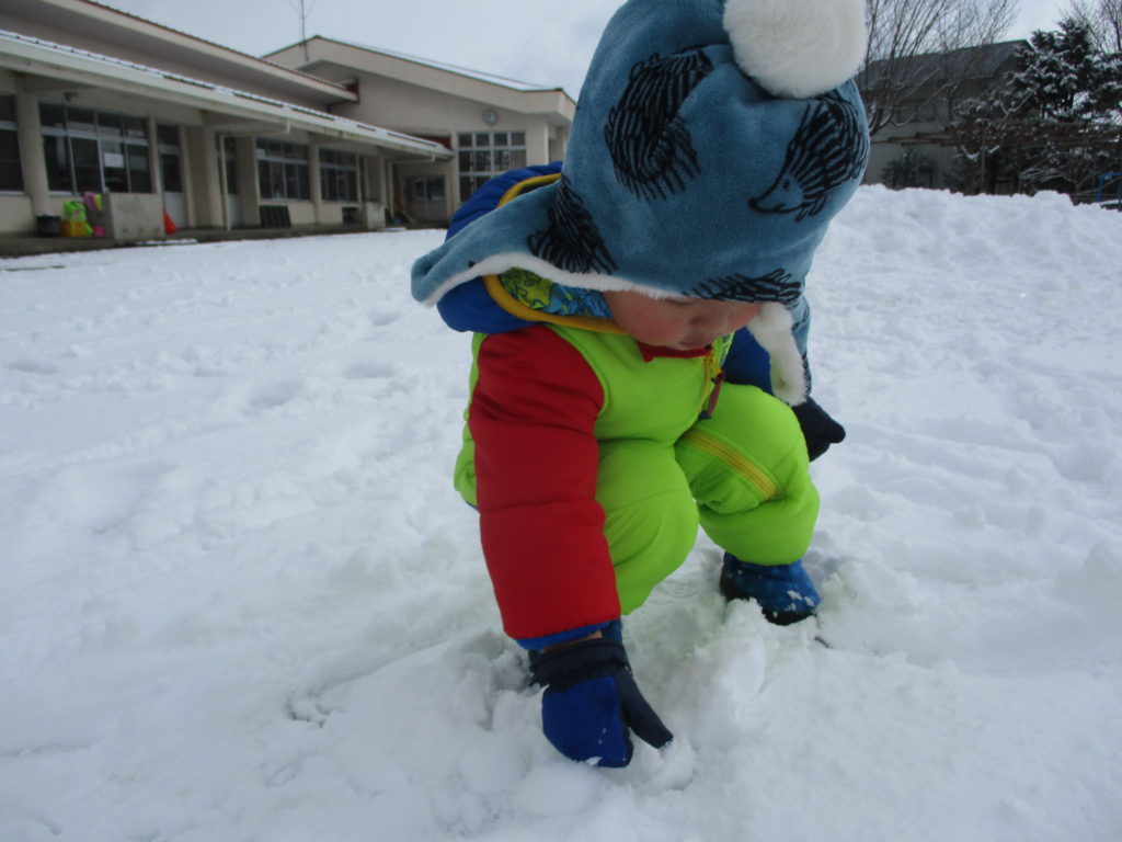 感じ取ったことを自分なりに表してくれる子ども達。保育士が一緒に遊び声をかけ味わうことで、”雪”の楽しさ、不思議さ、魅力に気づいているようです。こうした経験を積む中で、子どもの豊かな情感を育くみ、更に周囲のいろいろな事象に気づいてけるように関わっていこうと思います。